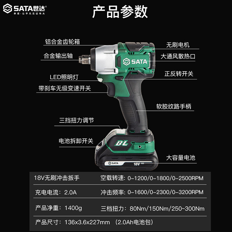 SATA/世达J系列18V锂电无刷冲击扳手 51075C 包含一电一充 5Ah