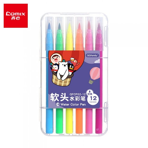 齐心(Comix)QQFamliy 文具水彩笔软头可水洗水彩笔绘画勾线笔儿童美术课涂鸦笔 12色 QFCP02-12