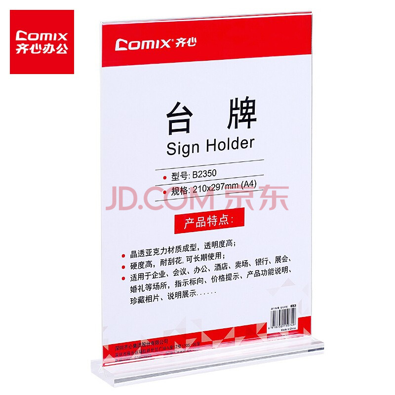 齐心(COMIX)高透明亚克力透明亚克力桌牌/展示牌/台卡/酒水牌 T型A4竖式 B2350