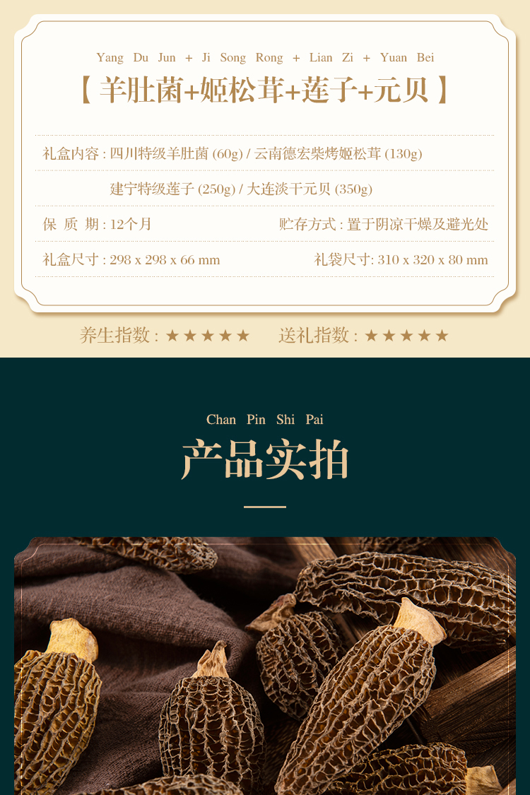 四川特级羊肚菌(60g)/云南德宏柴烤姬松茸(130g) 建宁特级莲子(250g)/大连淡干元贝(350g)