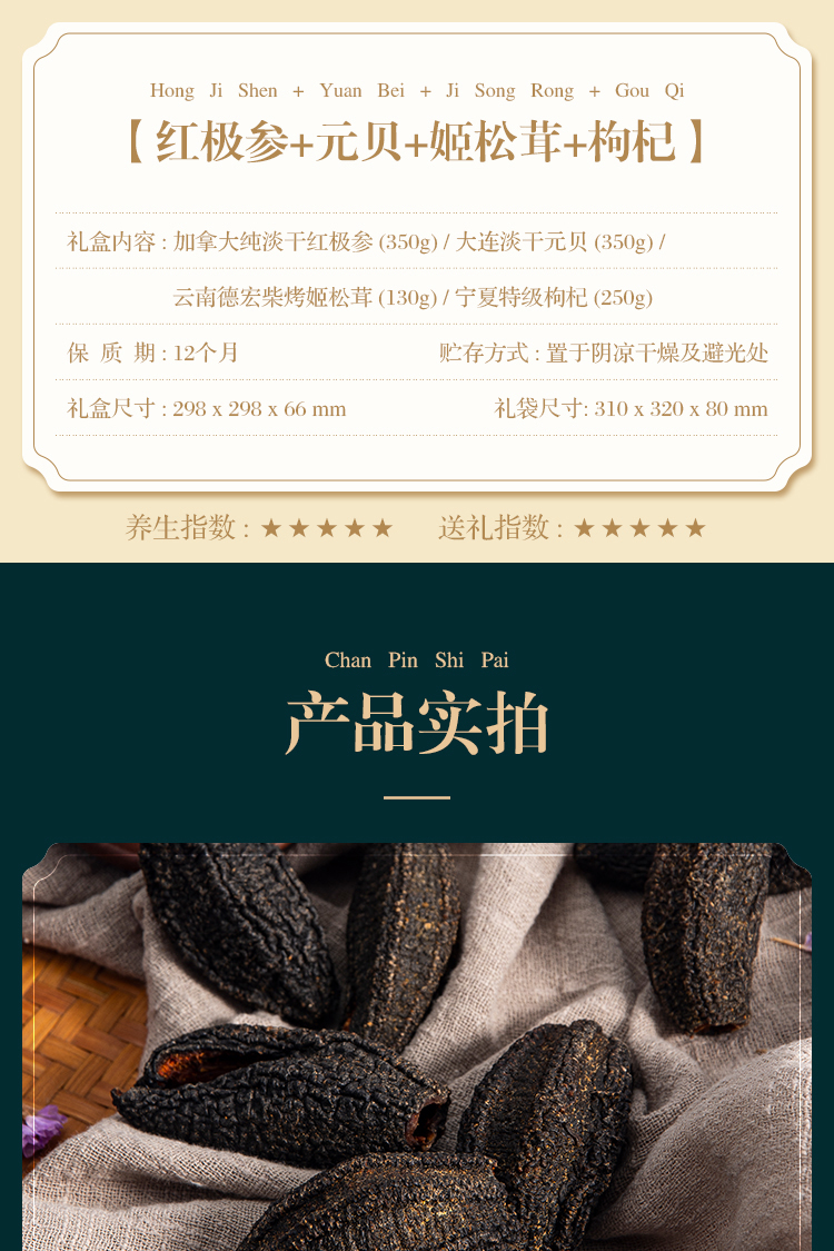 红极参(350克) 元贝(350克) 姬松茸(130克) 枸杞(250克)
