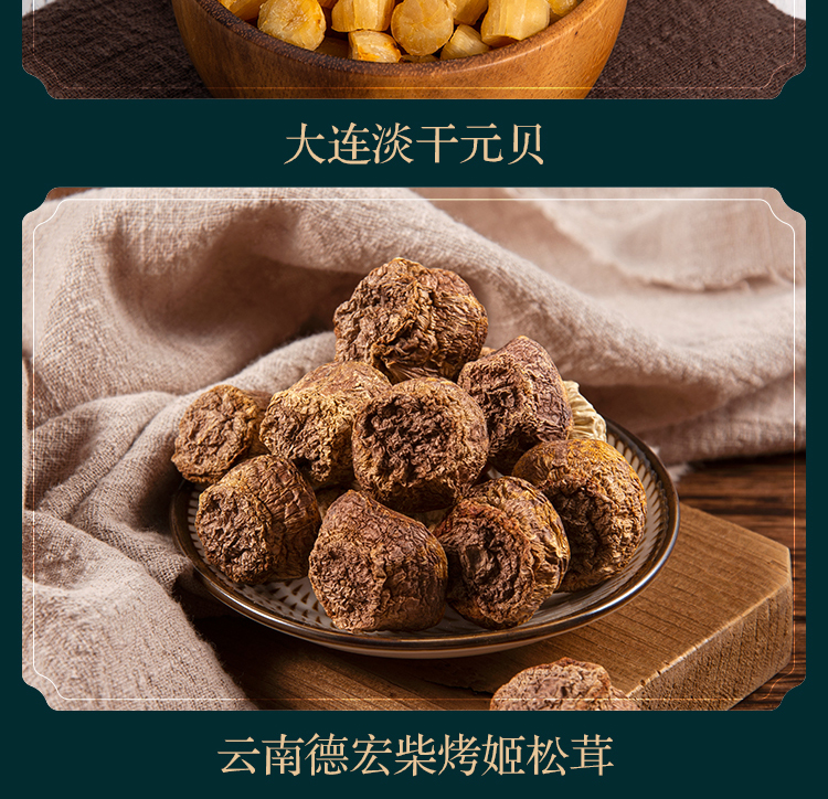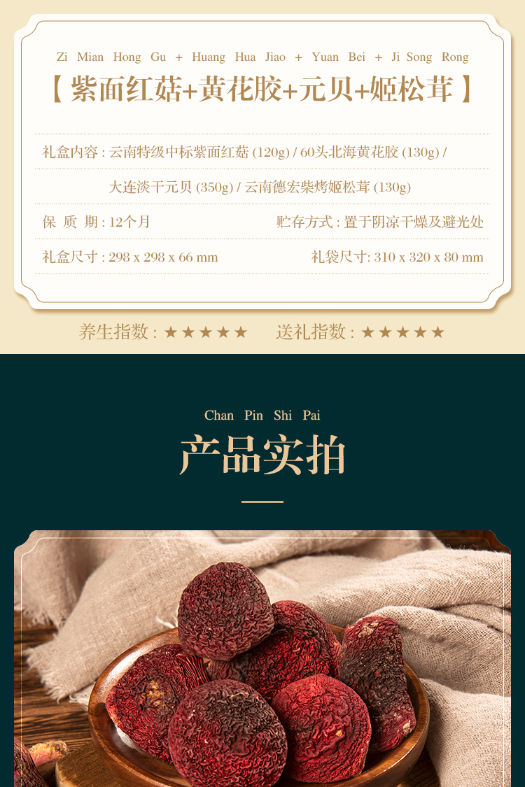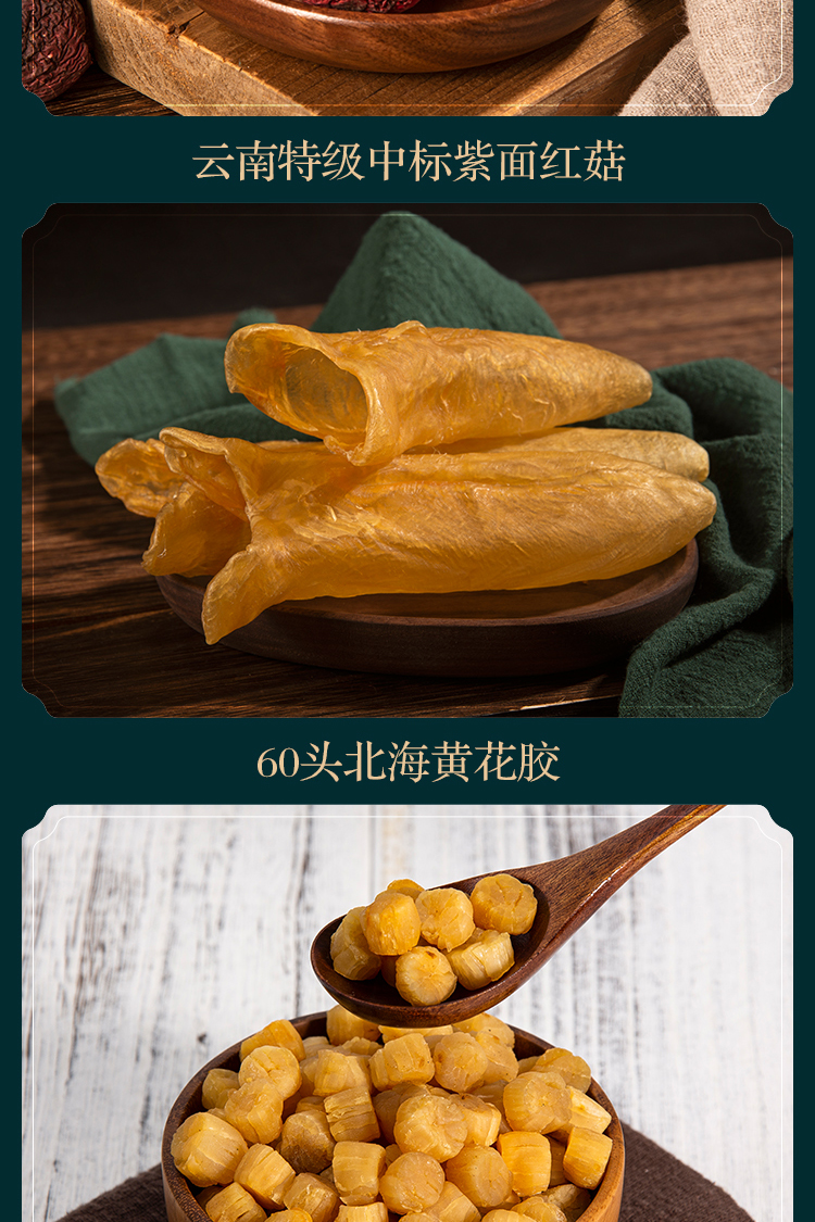 紫面红菇 (120克) 黄花胶(60头)[130克] 元贝 (350克) 姬松茸(130克)