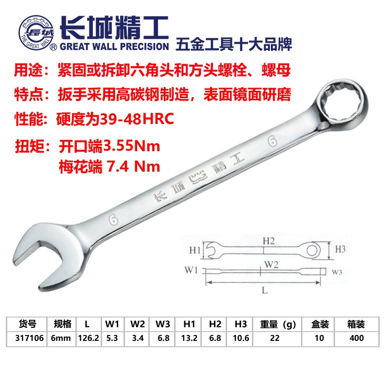 长城精工 两用扳手 开口梅花扳手 硬度高 6mm 317106