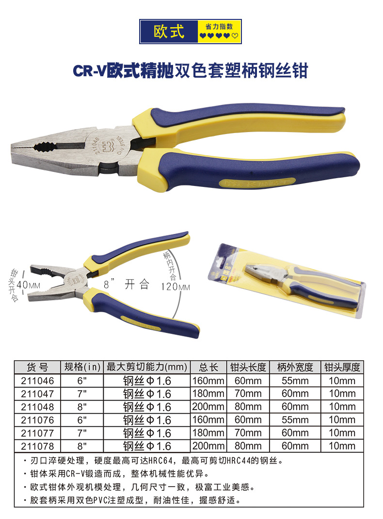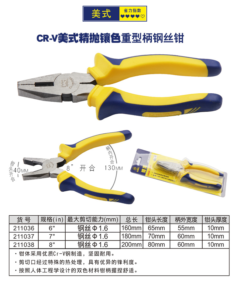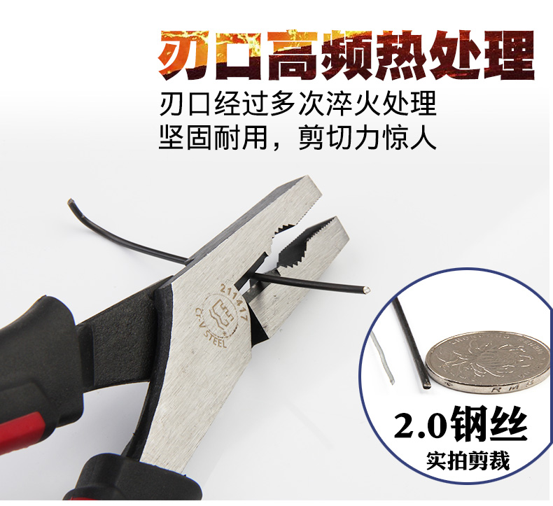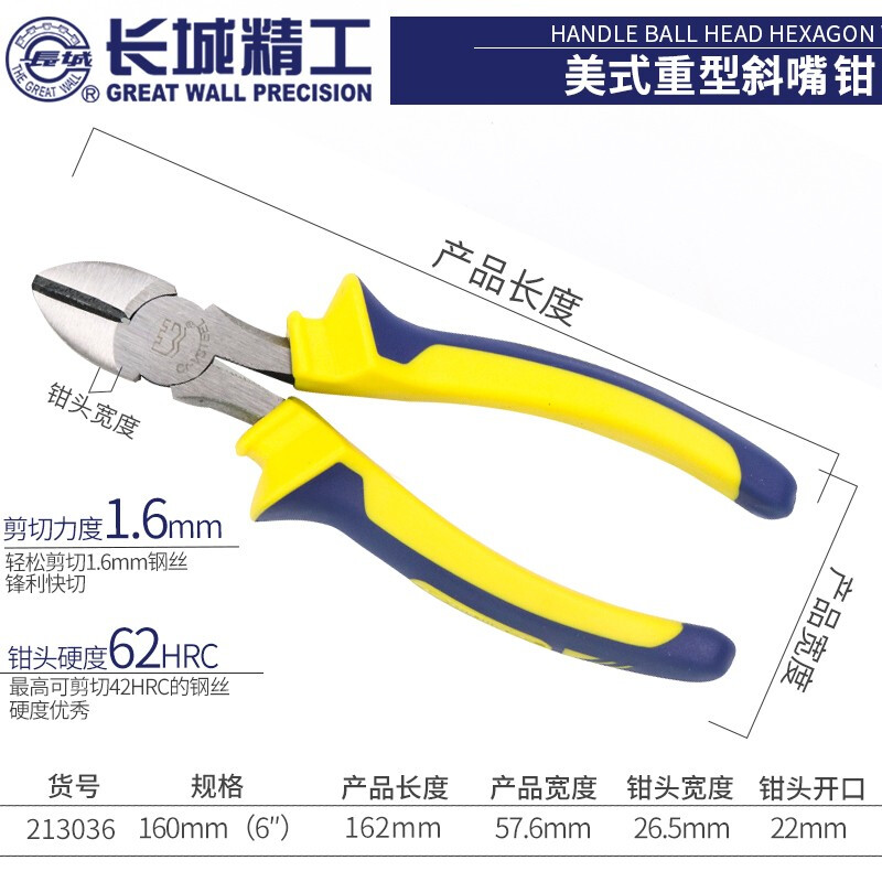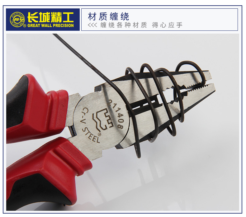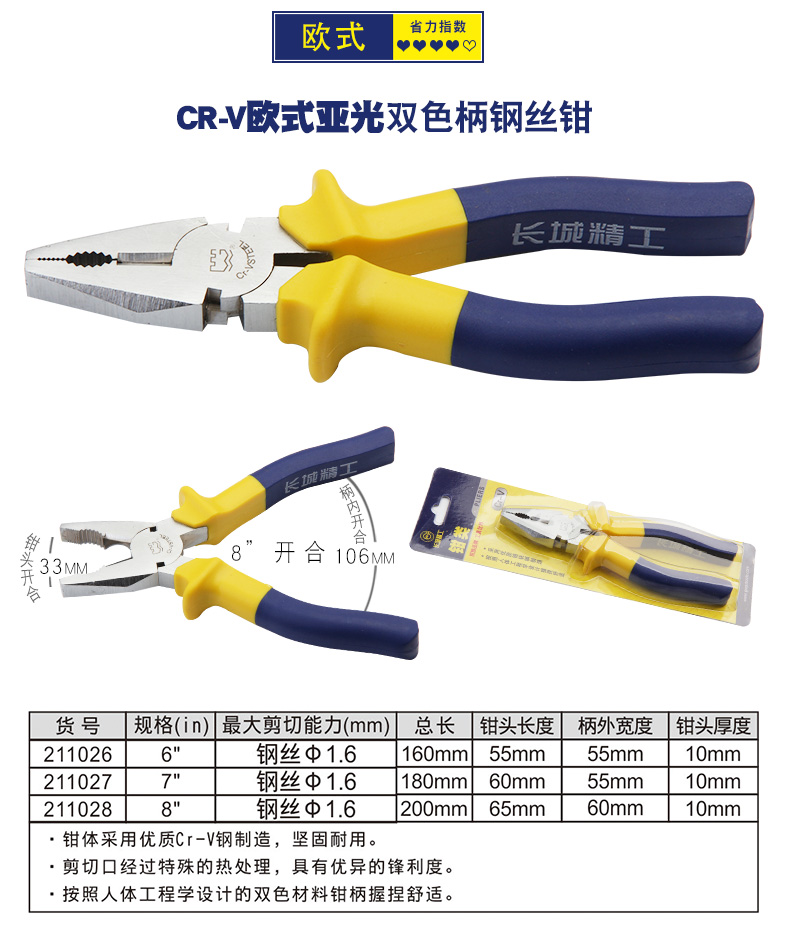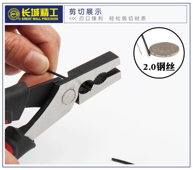 长城钢丝钳 00mm7/8寸 6寸Cr-V欧式精抛双色套塑柄钢丝钳211076
