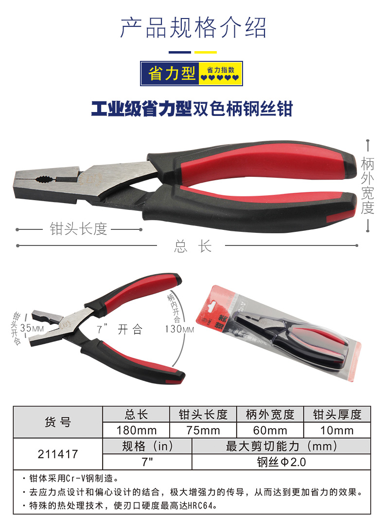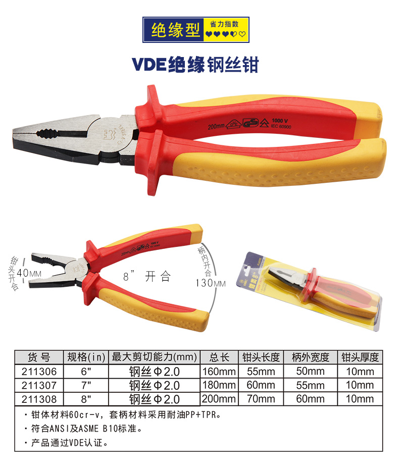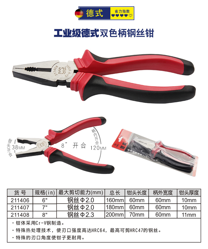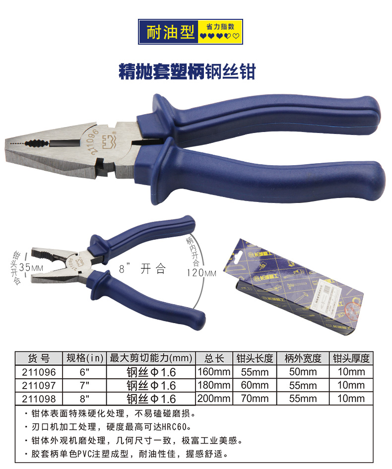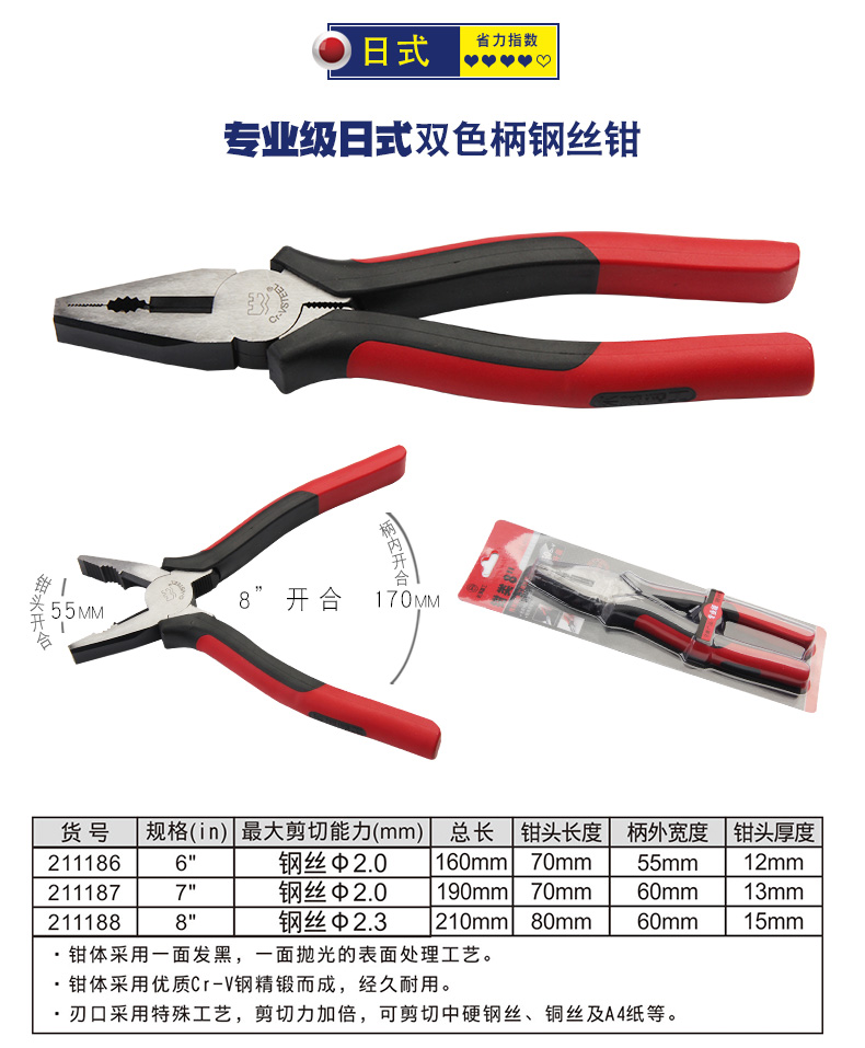 长城钢丝钳 00mm7/8寸 6寸Cr-V欧式精抛双色套塑柄钢丝钳211076