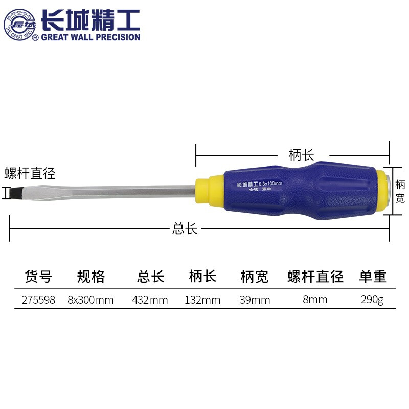 长城精工 一字穿心螺丝刀 全硬强磁工业级螺丝批 改锥 8*300mm 275598