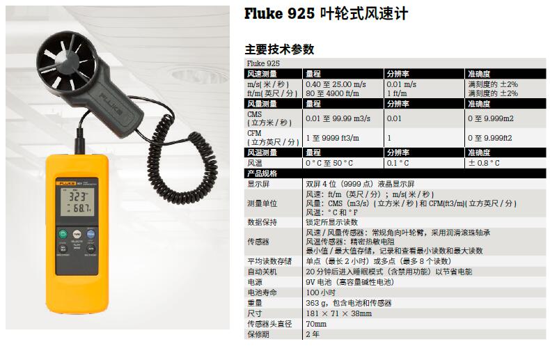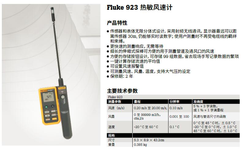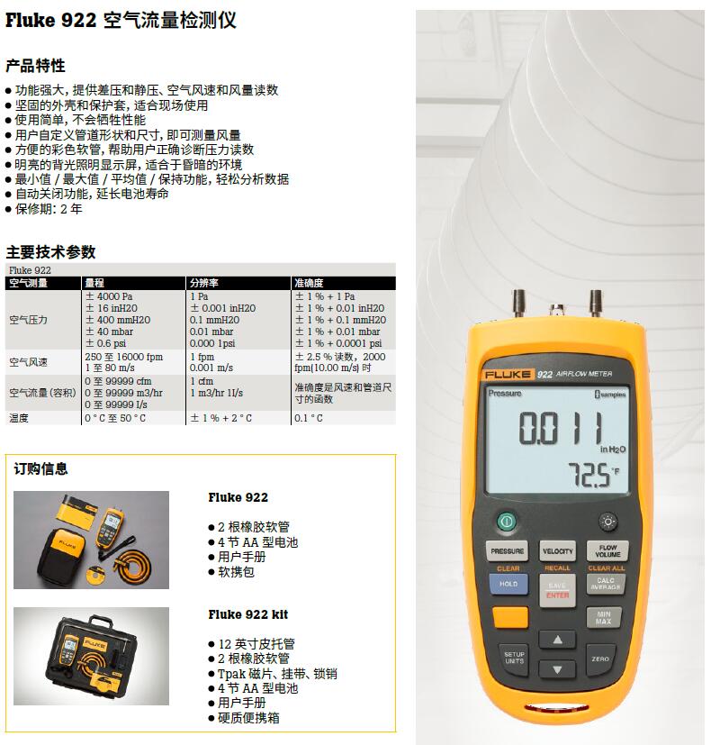 福禄克FLUKE 922/923/925空气流量检测仪高精度流量差压计风量风温风压风速计测试仪 FLUKE-923远程分离式热敏风速仪