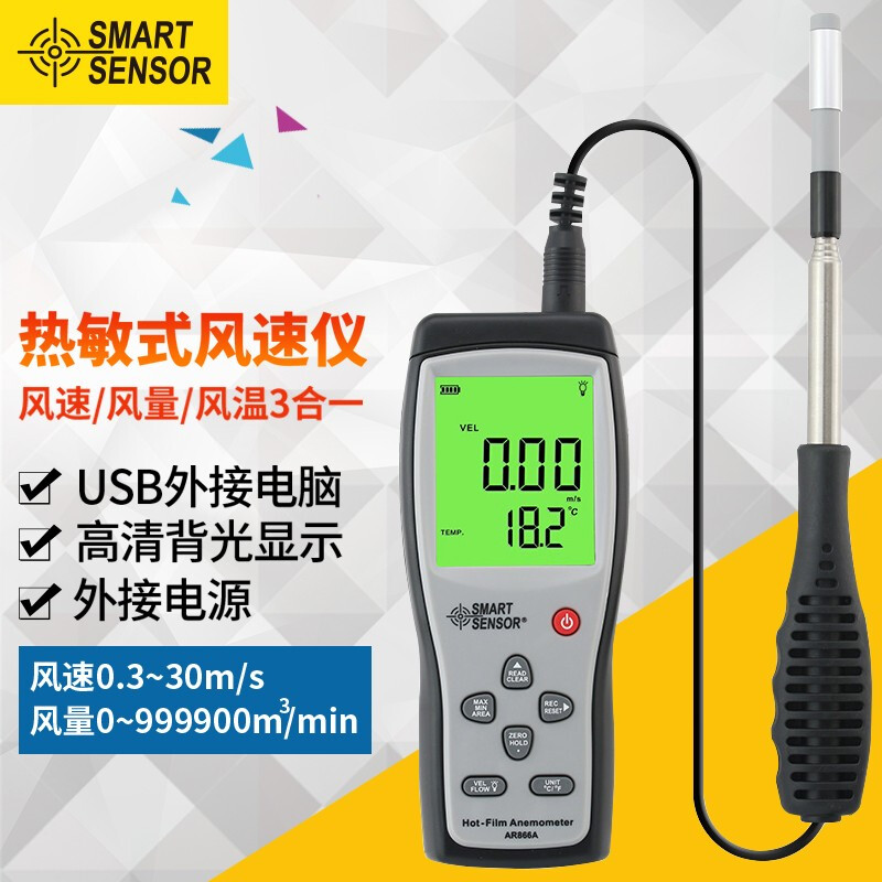 希玛 热敏式风速仪 高精度数字热线式风速计 测风仪 风速风温风量测量仪 AR866A(锂电直充,可USB数据传输)