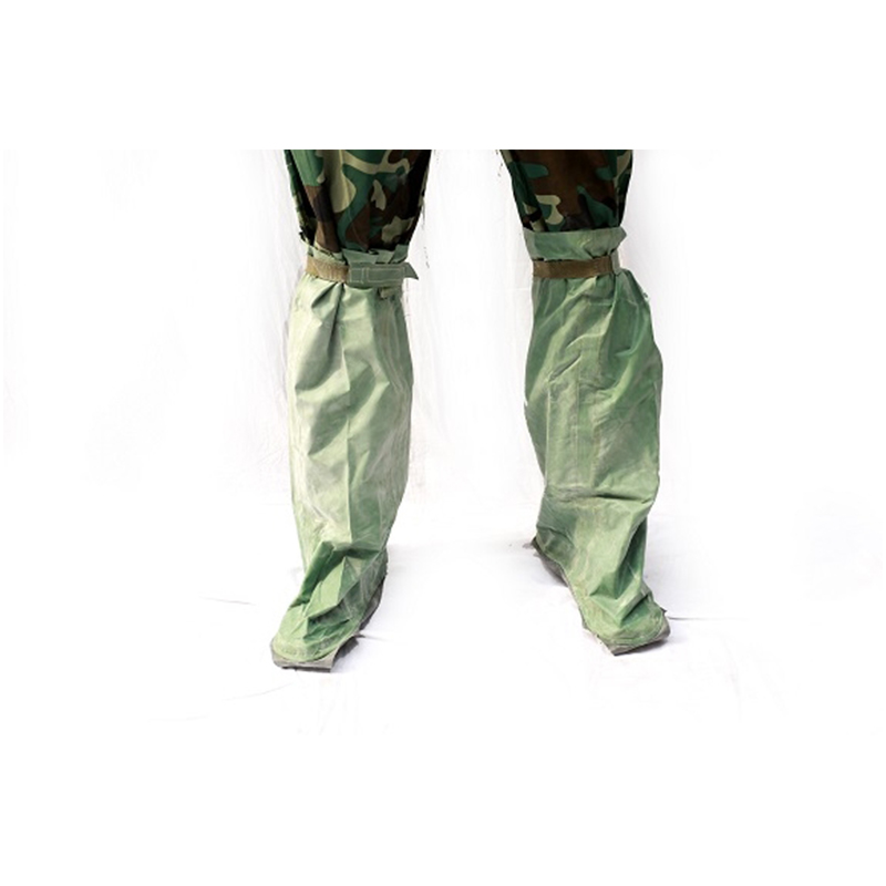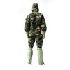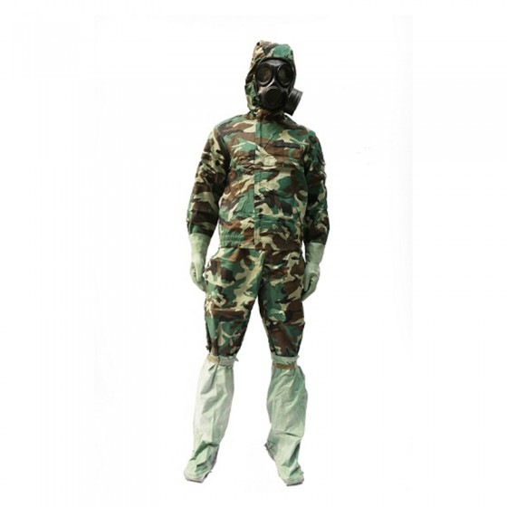 防毒服由带帽上衣和裤子组成。上衣和裤子的内门襟是专为防漏毒所设计的,穿着时应特别注意将内门襟拉平整。裤口用可以调节的松紧带密合。