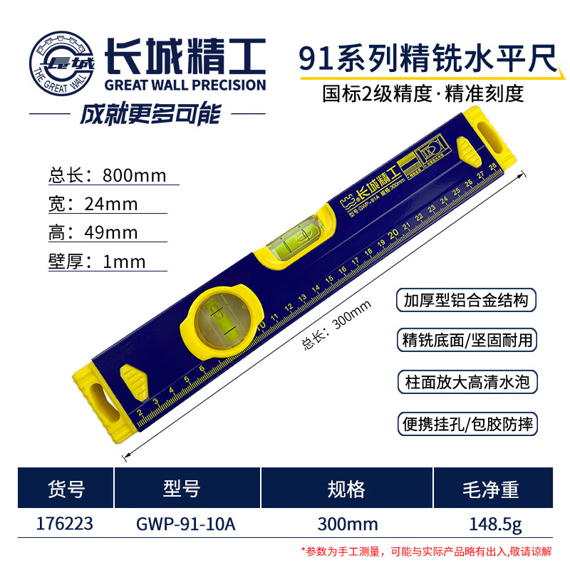 长城精工水平尺300mm铝合金高精度工业级91系列不带握手平水尺176223