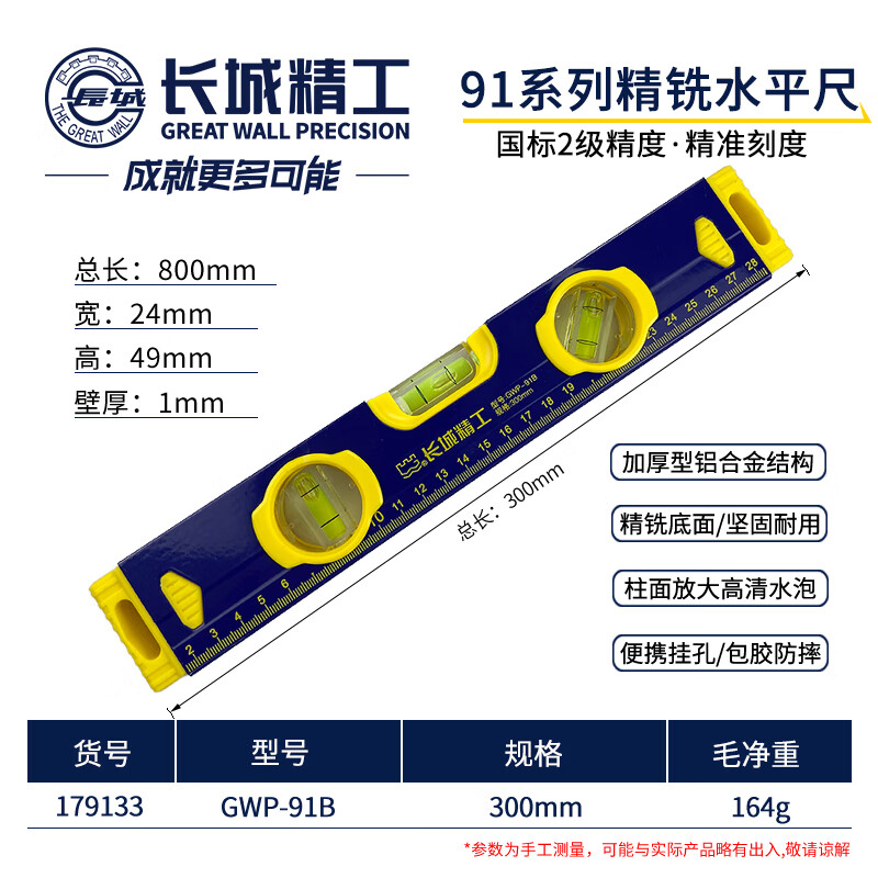 长城精工水平尺300mm铝合金高精度工业级91系列不带握手平水尺179133