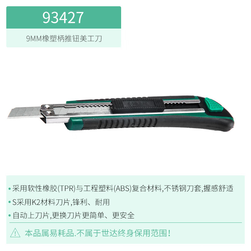 世达(SATA) 18mm塑柄推钮美工刀壁纸安全开箱刀裁纸刀 93422A 13节9x80MM 93427