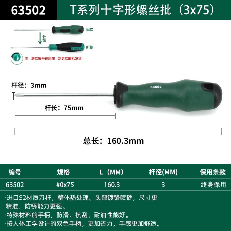 世达(SATA) 63502-63501 T系列十字型橡塑柄螺丝批磁头起子螺丝刀 #0*75mm 63502