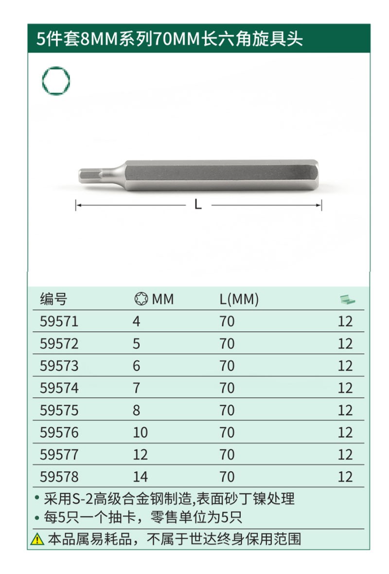 世达 SATA 5件套8MM系列六角旋具头 59474-5件套8MM系列30MM长六角旋具头8