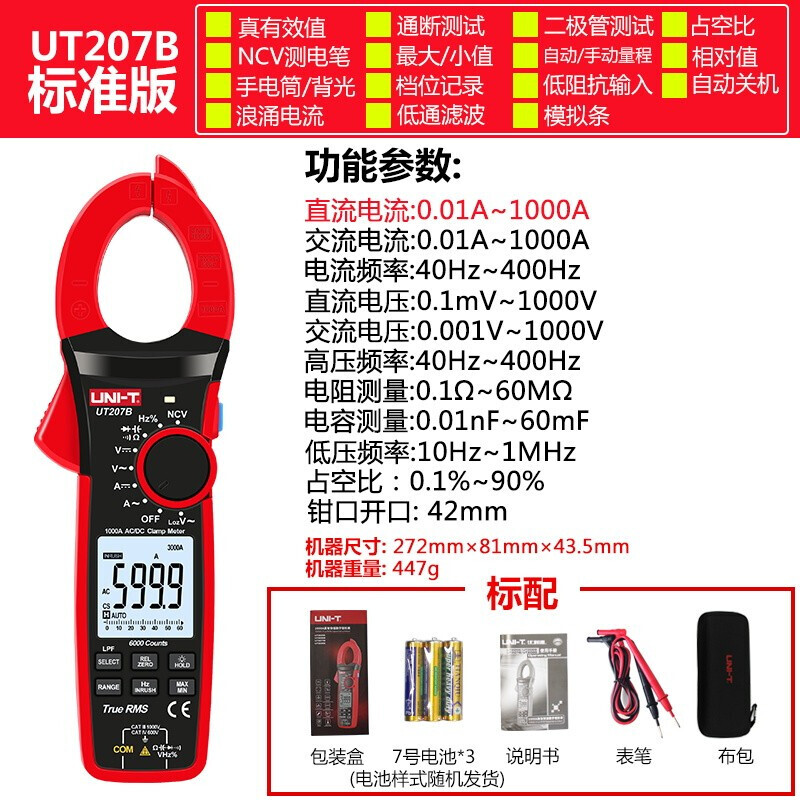 优利德(UNI-T)UT207B 真有效值数字钳形表 万能表 钳表 交直流1000A高精度防烧万用表
