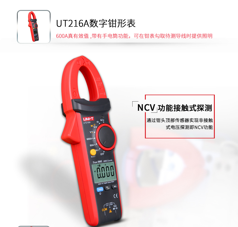 【官方直销】优利德UT216A数字钳形万用表高精度数显电流钳表 【UT216A】交流600A+测电笔功能