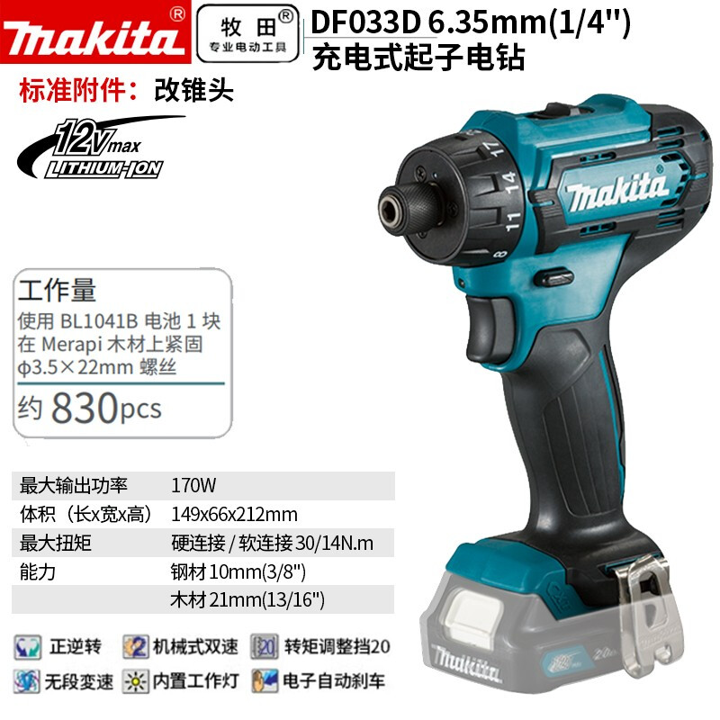 牧田/MAKITA DF033锂电池充电式起子电钻多功能电动螺丝刀电钻手枪钻手持锂电转12V 裸机款10mm