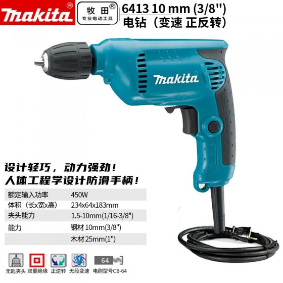 牧田/MAKITA 6413手电钻正反调速起子机多功能螺丝刀螺丝批开孔手枪钻450W 10mm(3/8