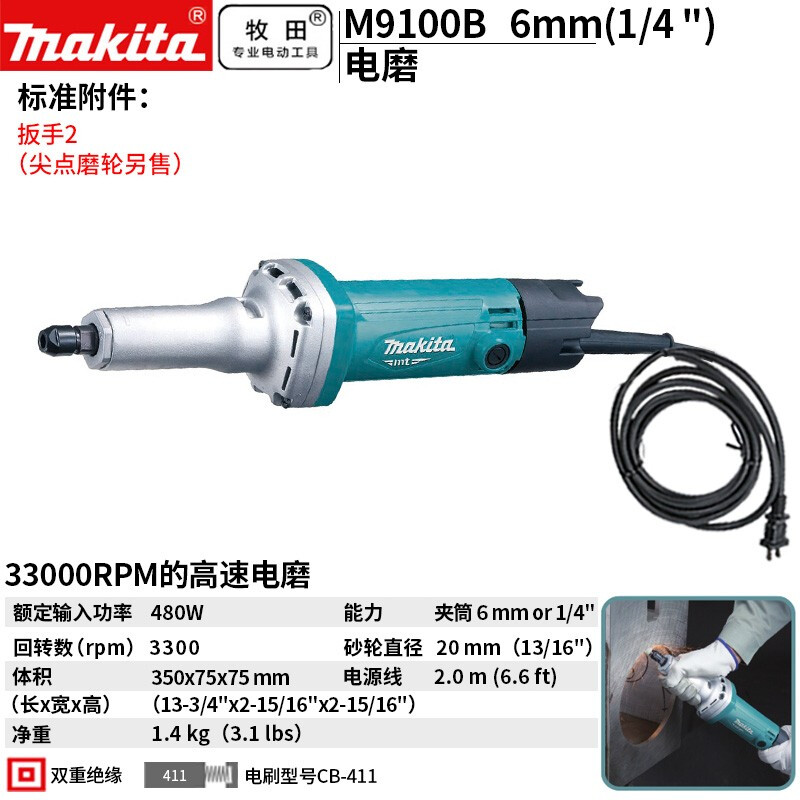 牧田 MAKITA/ M9100B电磨直磨机电磨机打磨机小型手持打磨抛光内磨雕刻直磨机工具6mm 480W