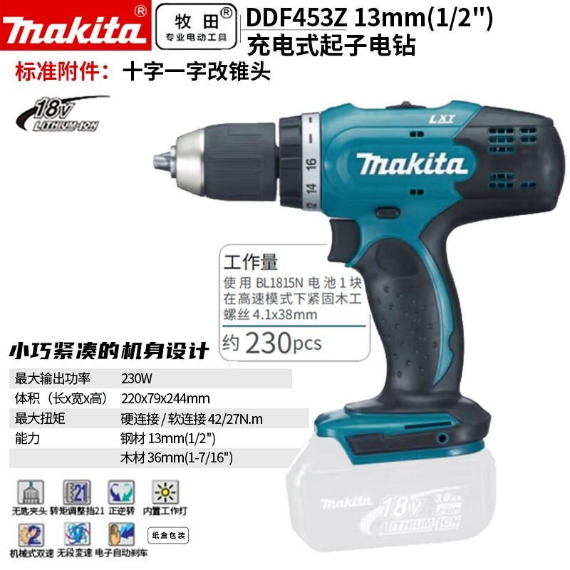 牧田/MAKITA DDF453Z锂电池充电式起子电钻大功率起子机螺丝刀螺丝批开孔手枪钻电转13mm18V 裸机版