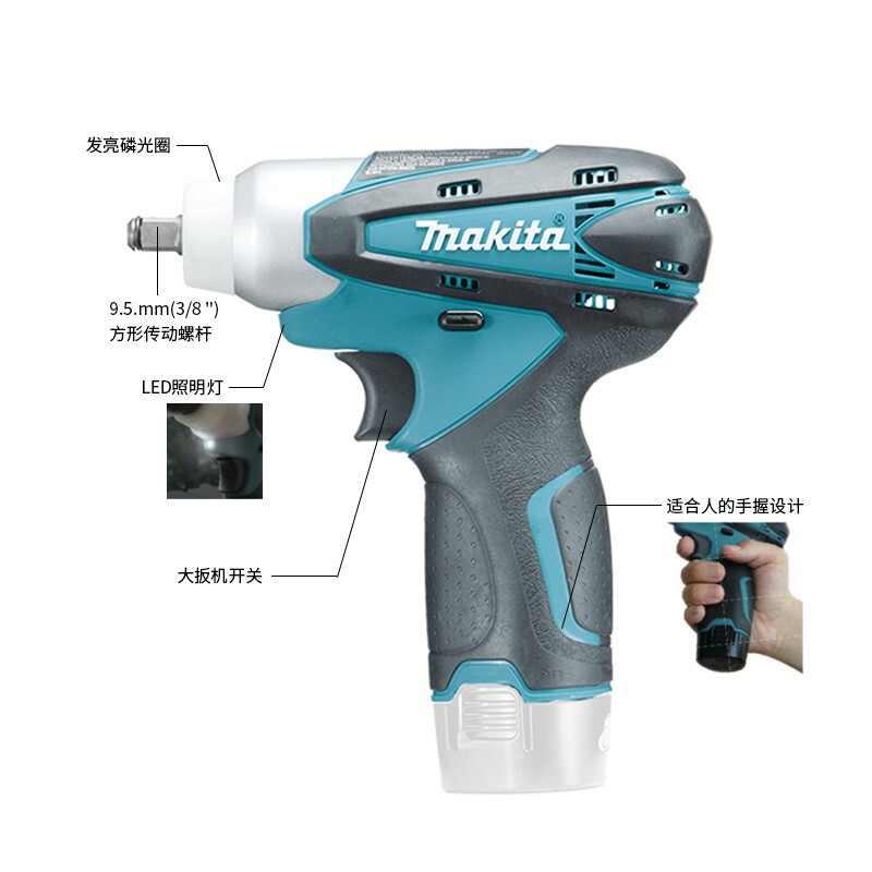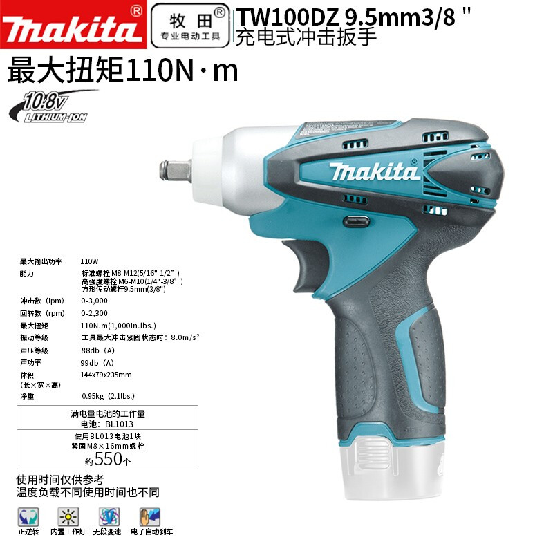 牧田/MAKITA TW100DZ锂电池充电式冲击扳手套筒电扳手方形传动螺杆 10.8V裸机版9.5mm(3/8)