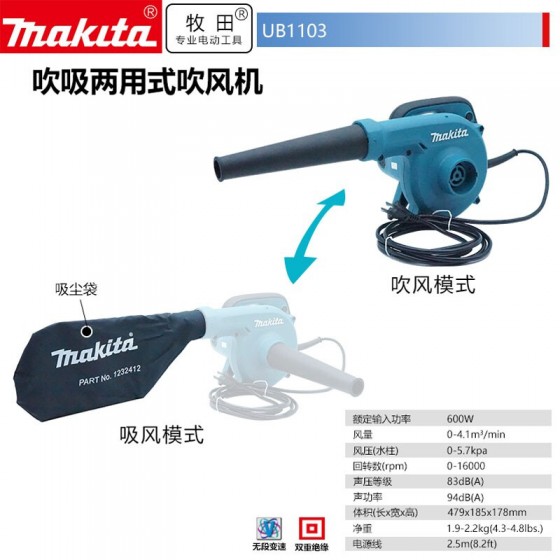 牧田/MAKITA UB1103吹风机插电式鼓风机吹吸两用式大功率小型吹灰除尘器600W