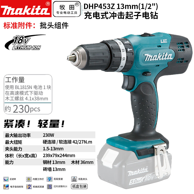 牧田/MAKITA DHP453Z锂电池充电式冲击起子电钻电动螺丝刀多功能木工金属开孔电转 18V裸机无电池充电器13mm