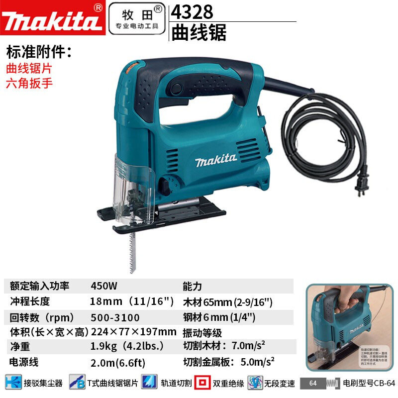 牧田 MAKITA/ 4300BV 插电式曲线锯多功能小型切割机手提式木工电锯拉花木板线锯企业定制 4327曲线锯450W