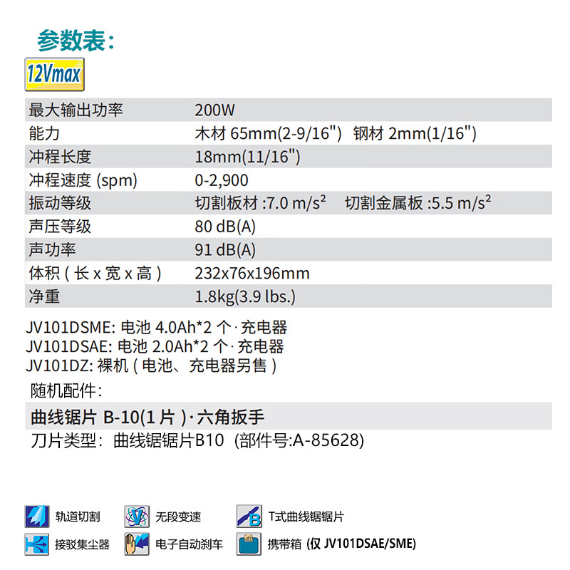 牧田/MAKITA JV101DZ锂电充电式曲线锯切割机手提式木工电锯拉花木板线锯 12V裸机