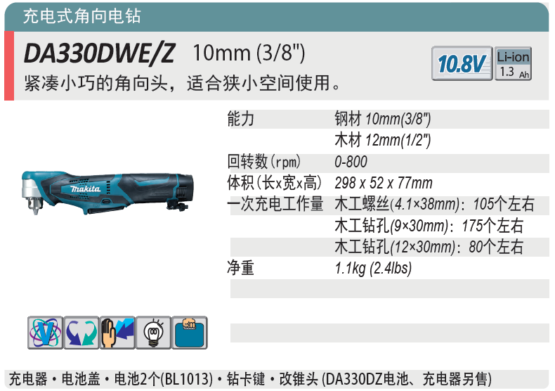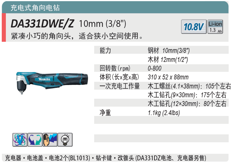 日本Makita牧田10.8V充电式锂电池无线角向电钻弯头起子机90度直角工业级电动工具DA331DZ裸机不含电池不含充电器 狭小空间可用
