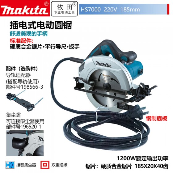 牧田/MAKITA HS7000插电式1200W木工电锯家用手锯木工锯迷你手提切割机185mm7寸