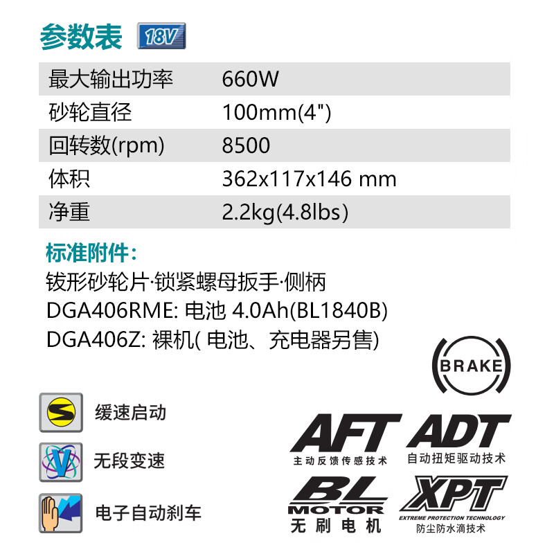 牧田/MAKITA DGA406Z角磨机裸机不含充电器电池100mm无刷角磨机多功能打磨机