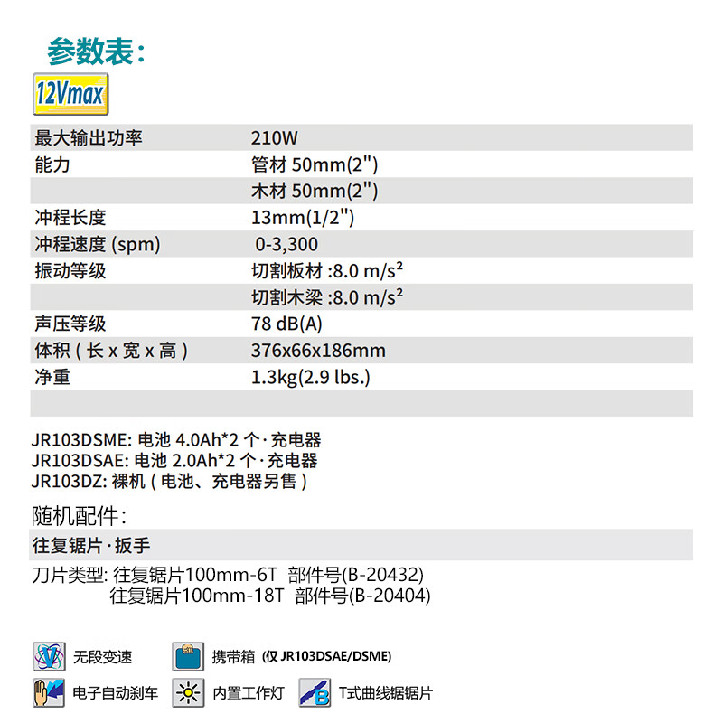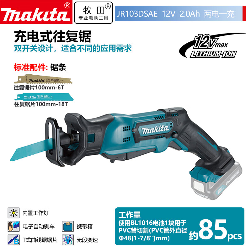 牧田/MAKITA JR103DSAE往复锯充电式往复锯可调速12V2.0AH两电一充