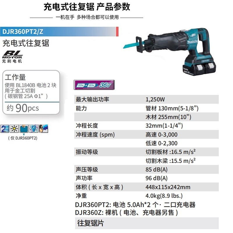牧田(MAKITA) DJR360Z 无刷充电式往复锯马刀锯 无充电器无电池 裸机款