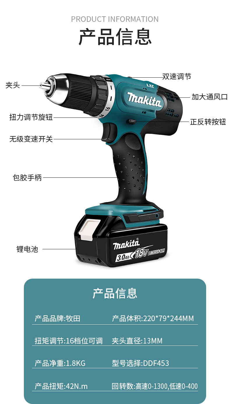 牧田(MAKITA) 18V锂电充电起子电钻DDF453 【4.0AH两电一充】DDF453RME