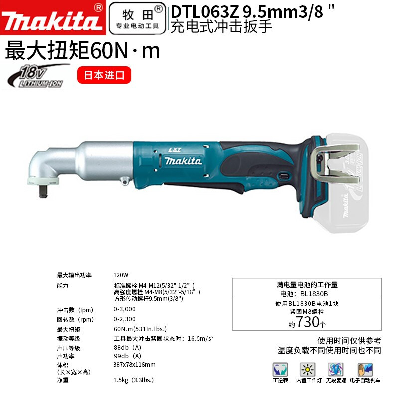 牧田/MAKITA DTL063Z锂电池充电式角向冲击扳手 18V裸机无充电器无电池9.5mm(3/8)