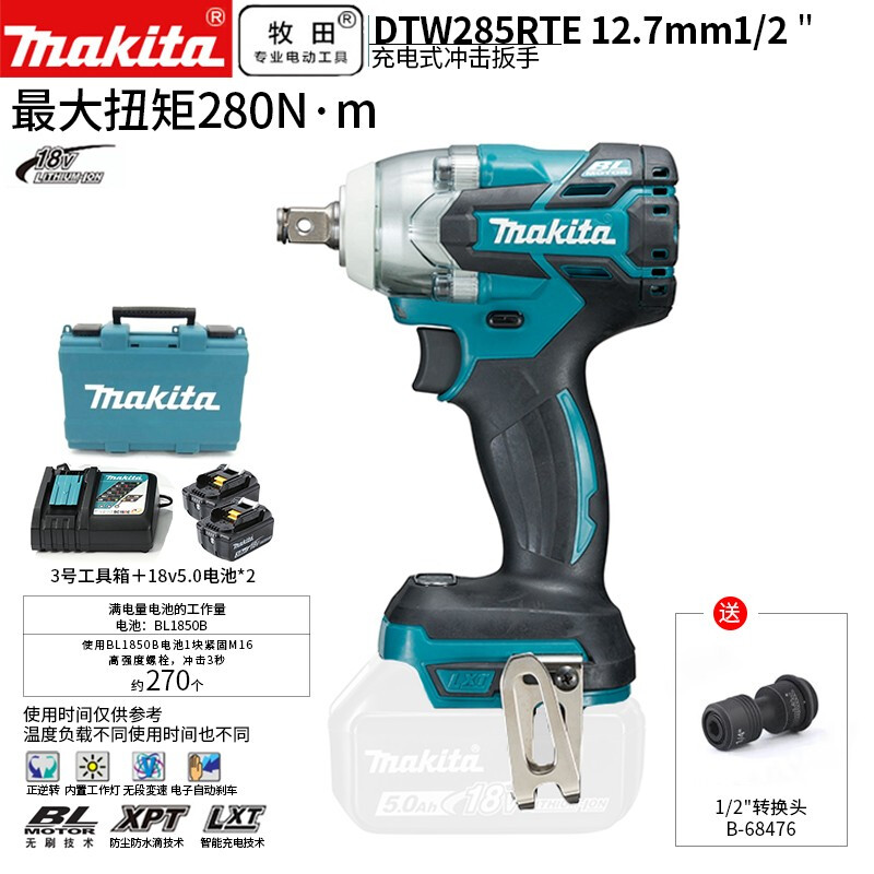 牧田/MAKITA DTW285RME无刷锂电池充电式冲击扳手大扭力 防尘防水滴 18V4.0Ah两电一充12.7mm(1/2)