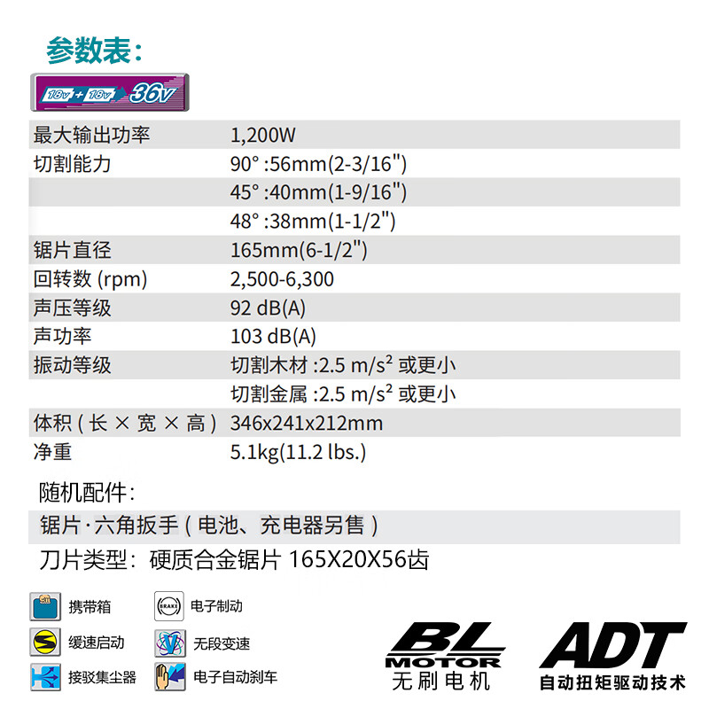 牧田/MAKITA DSP600ZJ无刷木工切割机锂电锯 裸机不含充电器电池165mm6寸