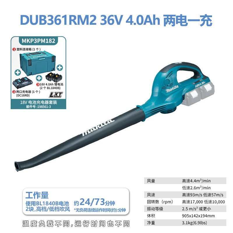 牧田/MAKITA DUB361RM2锂电池充电式吹风机 36V4.0Ah两电双口充电器纸盒装