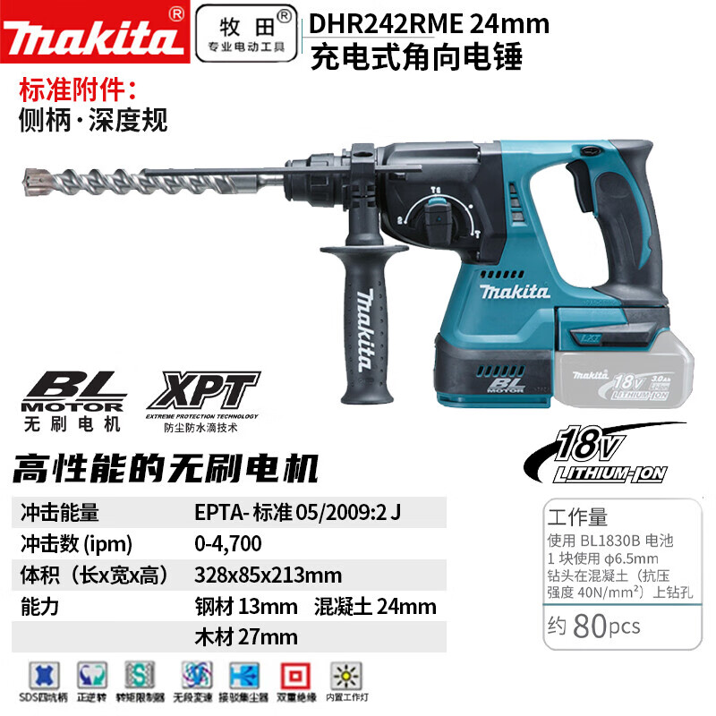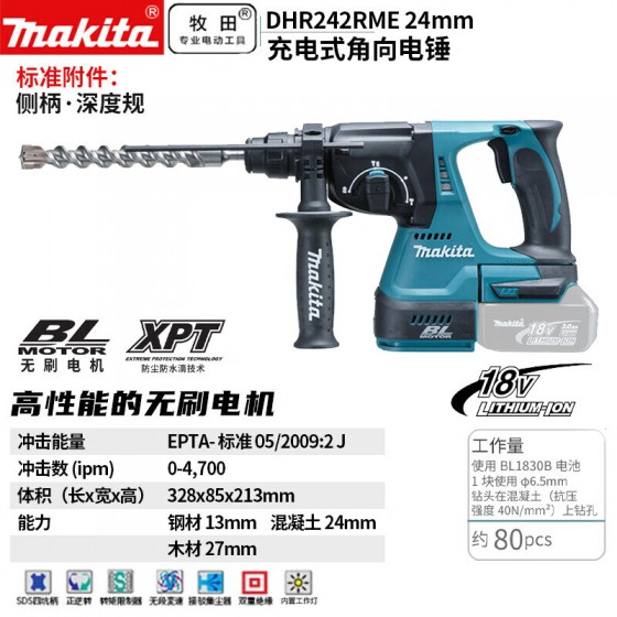 牧田/MAKITA DHR242RME锂电池充电式电锤无刷高功率电机充 4.0Ah两电一充18V24mm