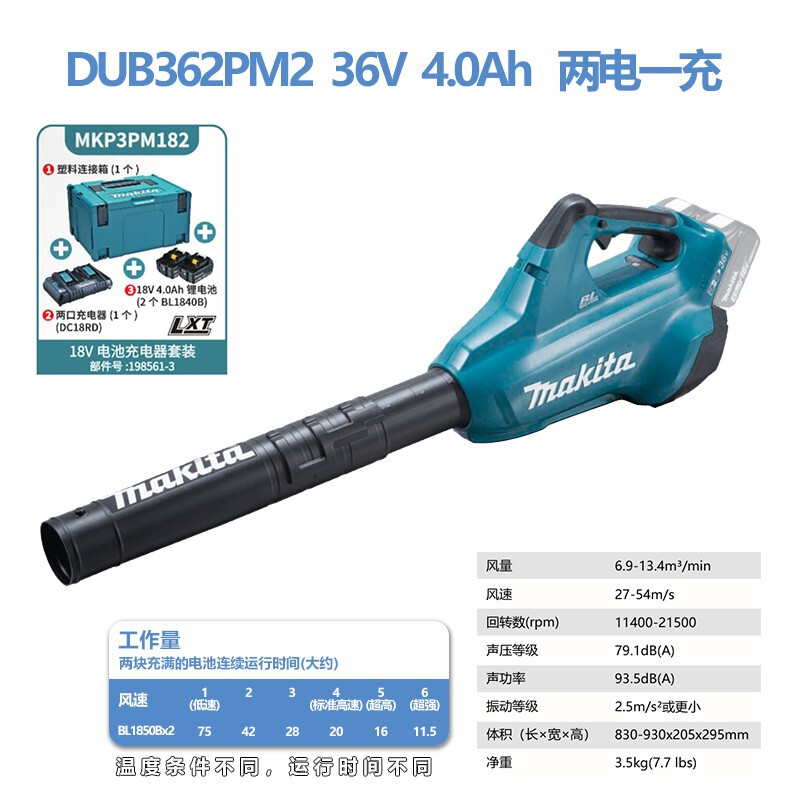 牧田/MAKITA DUB362PM2锂电池充电式无刷吹风机 36V4.0AH两电双口充电器纸盒装