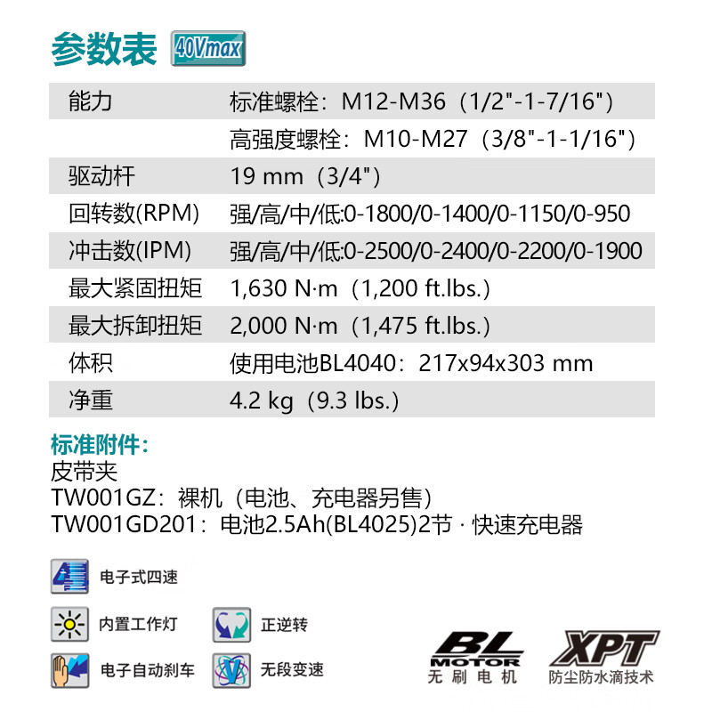牧田/MAKITA TW001GM201锂电池充电式冲击扳手无刷 40V4.0Ah两电一充19mm(3/4)