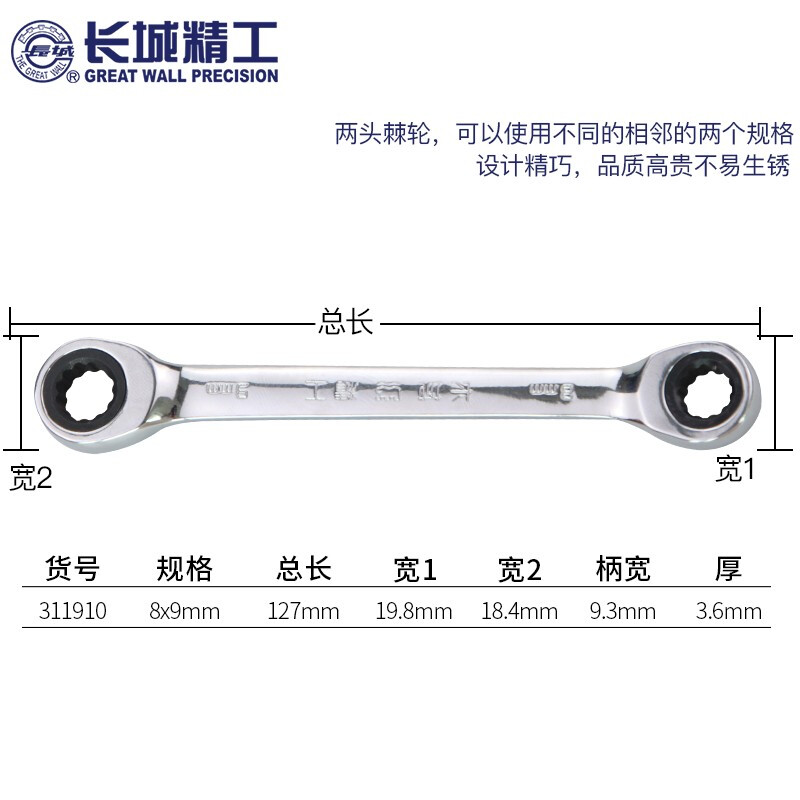 长城精工 棘轮双梅花扳手 双头眼睛扳手 快速扳手汽修工具 8-9mm 311910