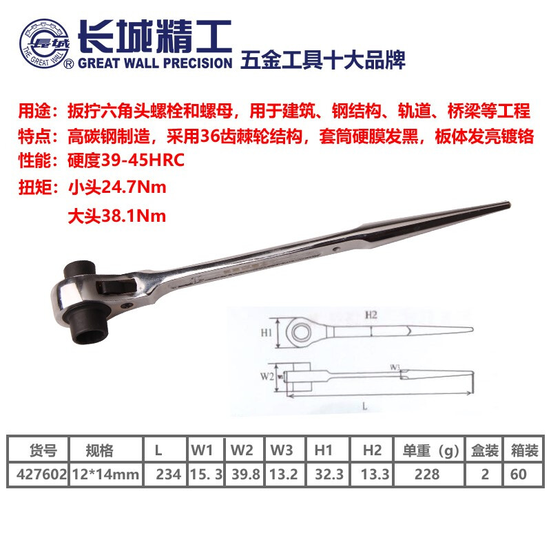 长城精工 尖尾棘轮套筒扳手 双头两用汽修扳手 12-14mm 427602