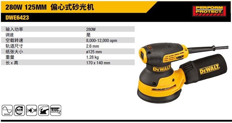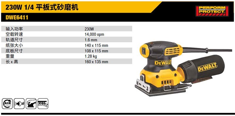 得伟DWE6423偏心砂磨机125圆型德伟木工家具墙面手持式砂纸打磨机1/4方型6411调速砂光机 DWE6411平板方砂机1/4
