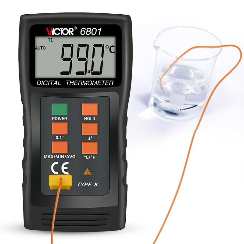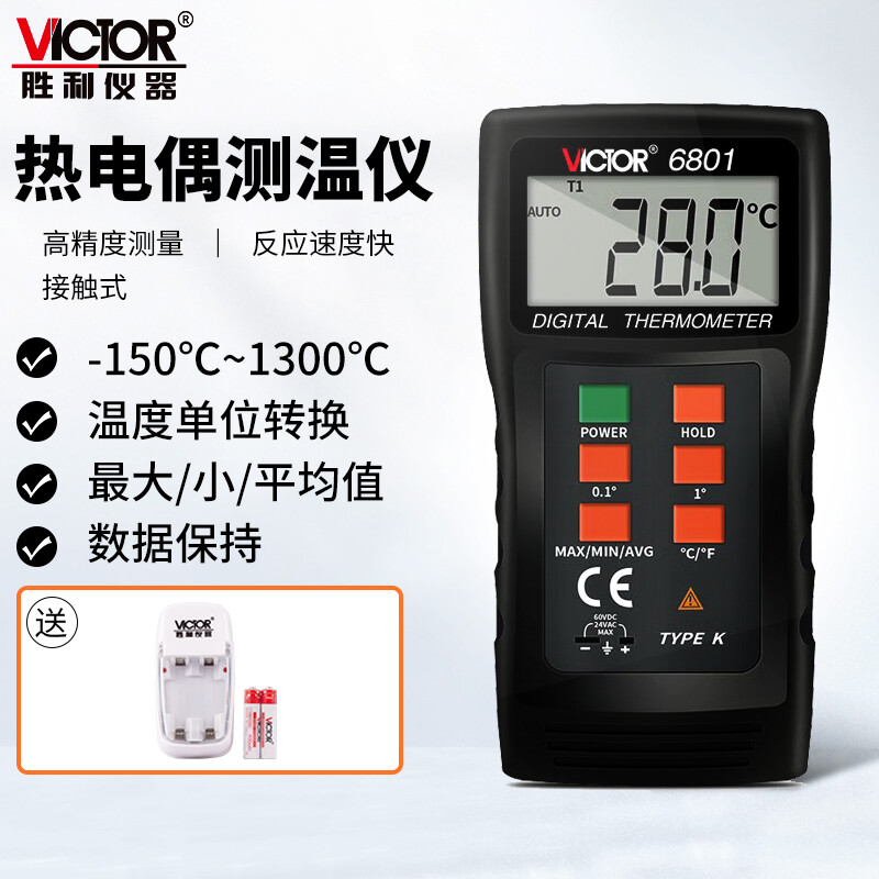 胜利仪器(VICTOR)电子温度计 带探头 高精度数字温度表 数显 热电偶温度计 K型数显测温仪 VC6801+充电套装