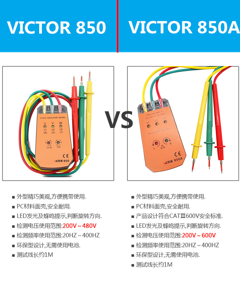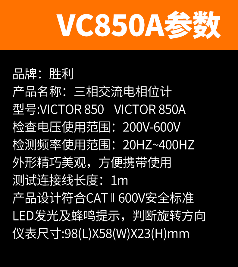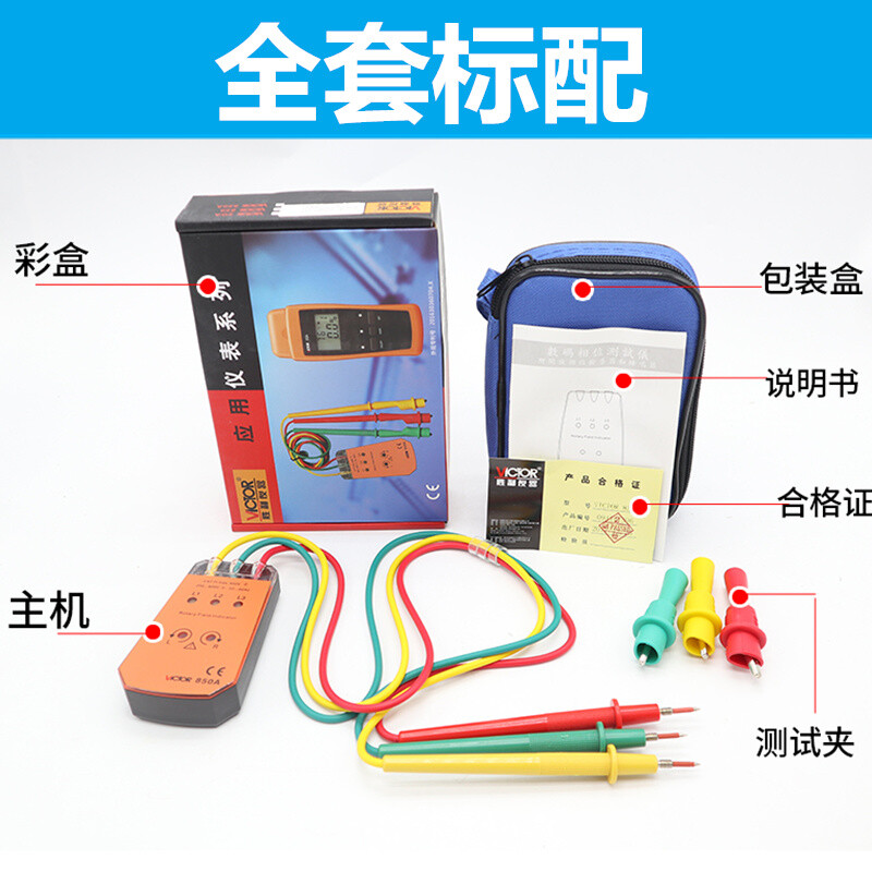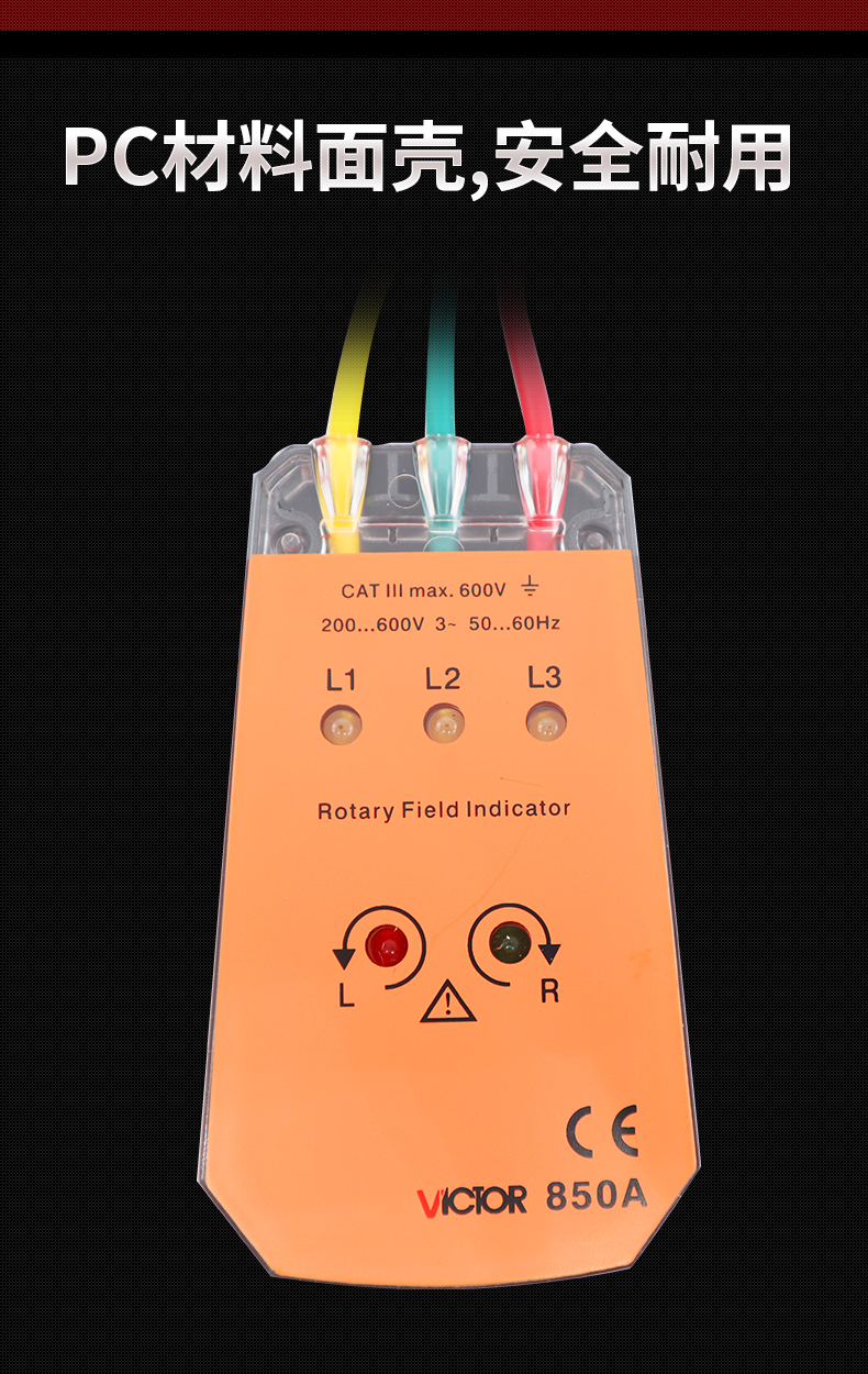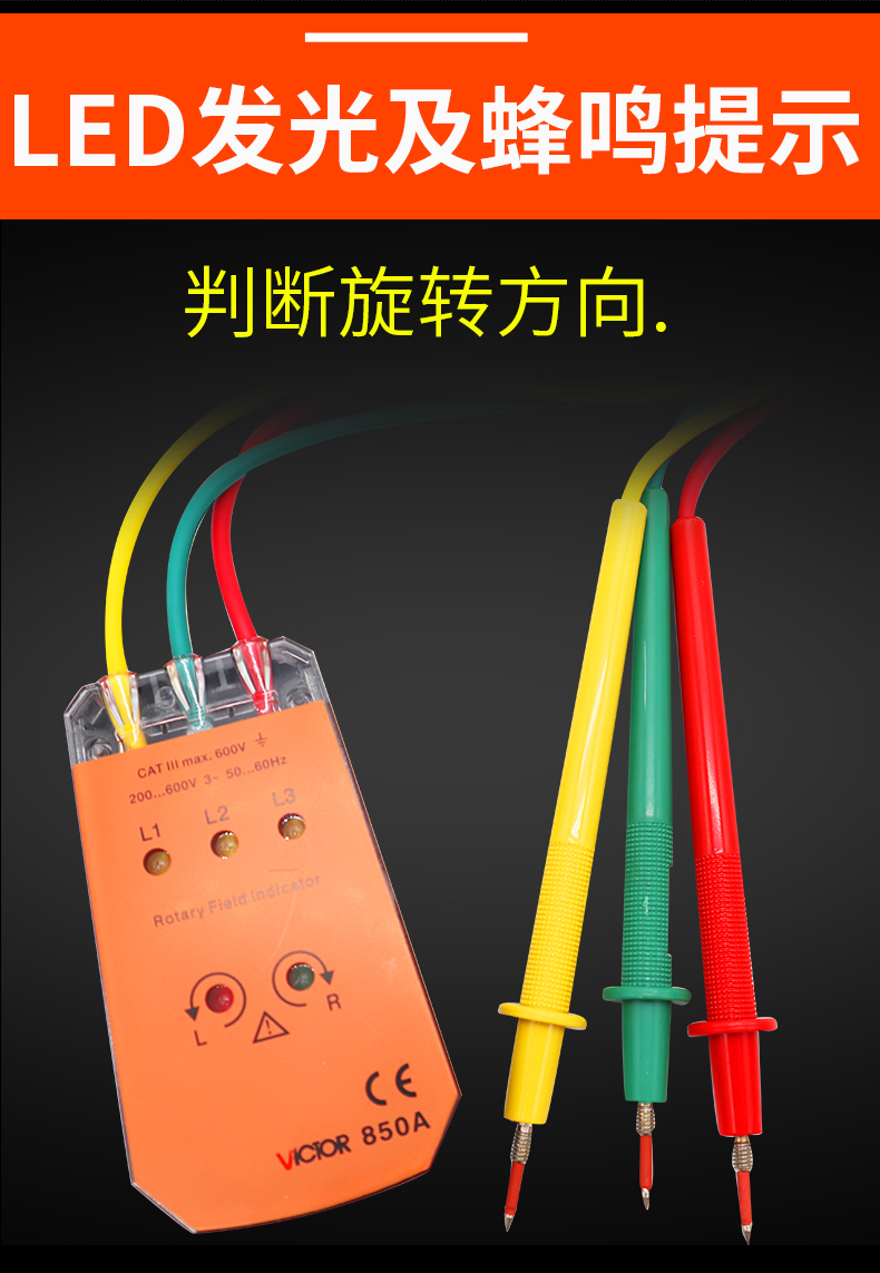 胜利 VICTOR 850三相交流电相序计 相序表 相位检测仪VC850A/C/D相位表 相序测试仪 VC850范围200V-480V