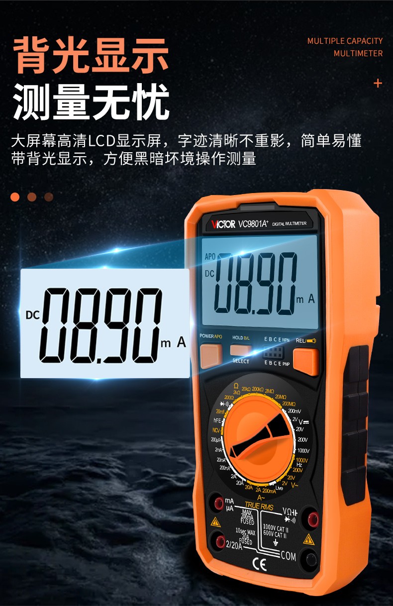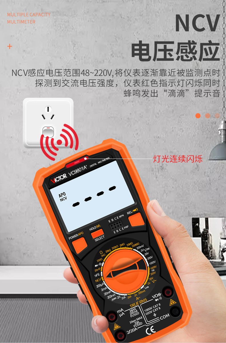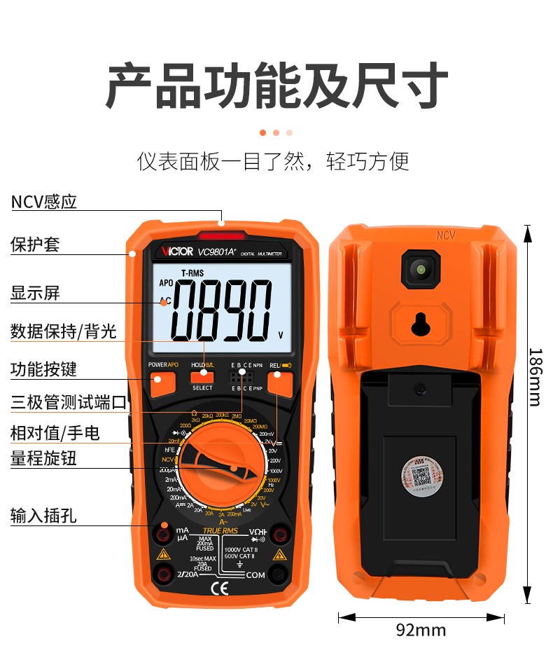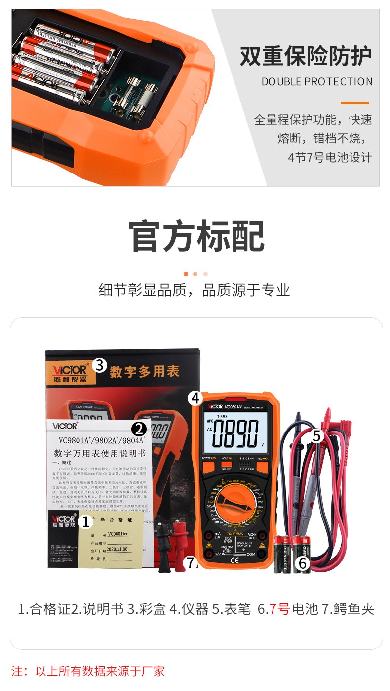 胜利仪器(VICTOR)数字高精度万用表电容表防烧电工数字万能表多用表 VC980+标配(4节7号电池)