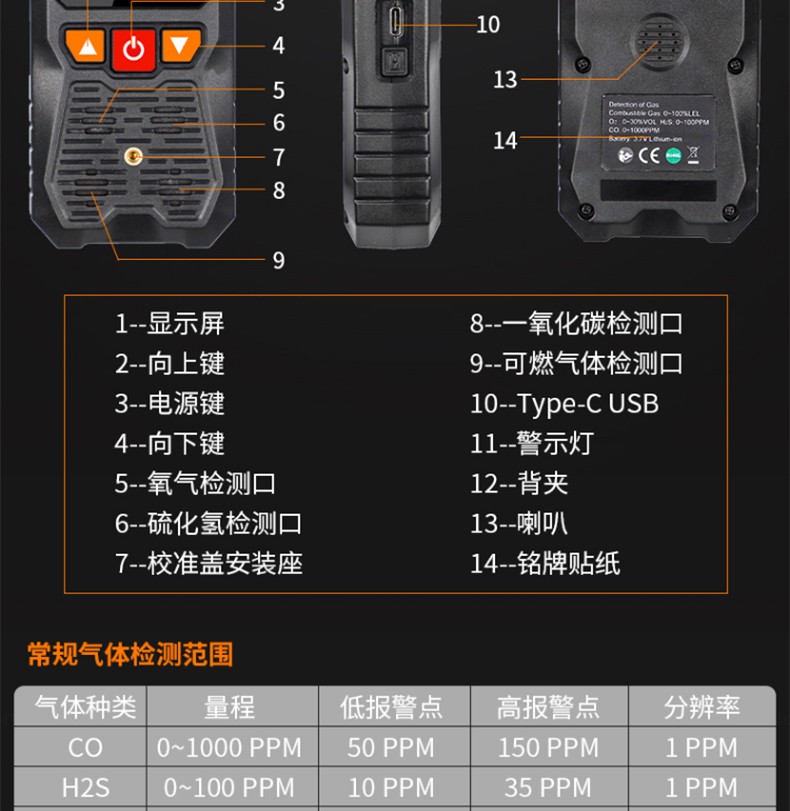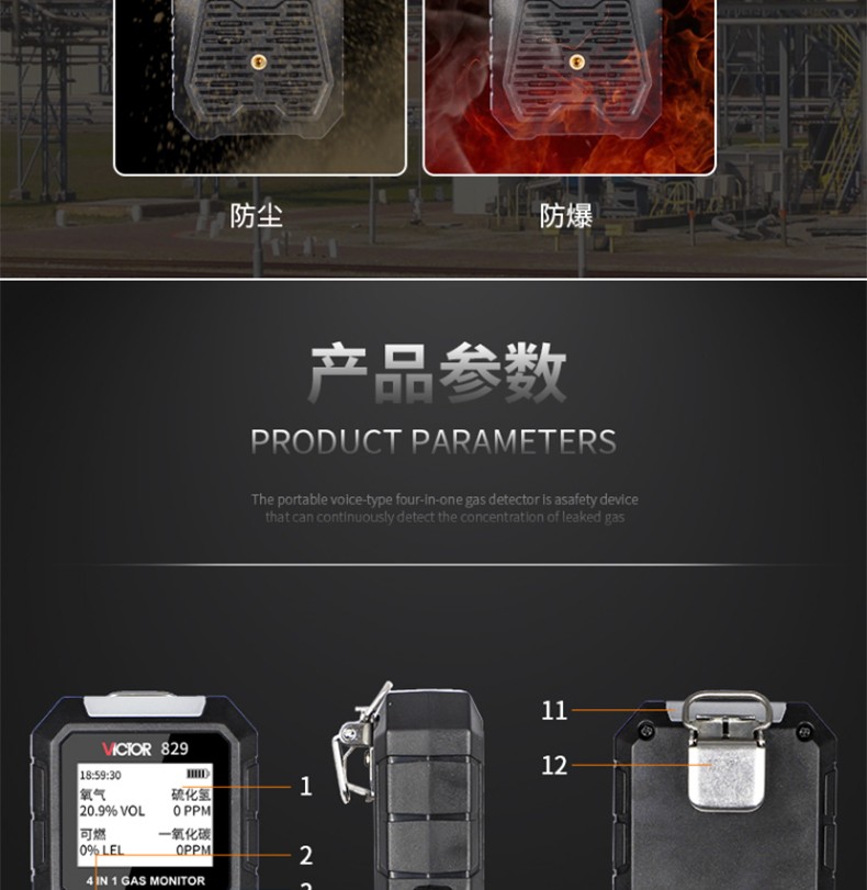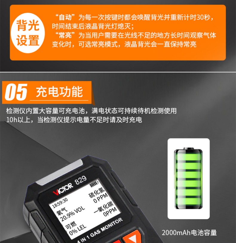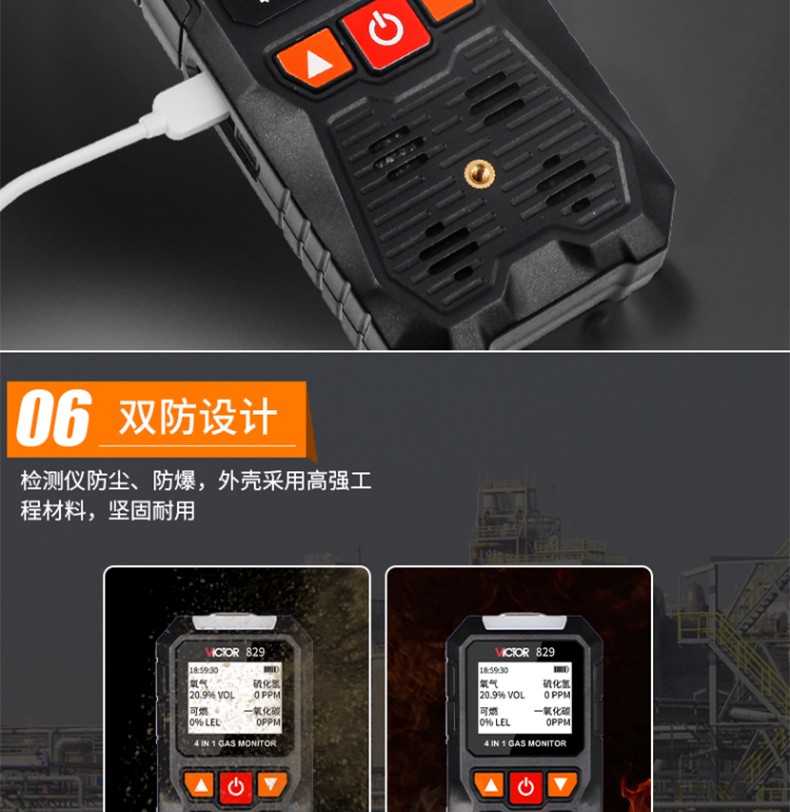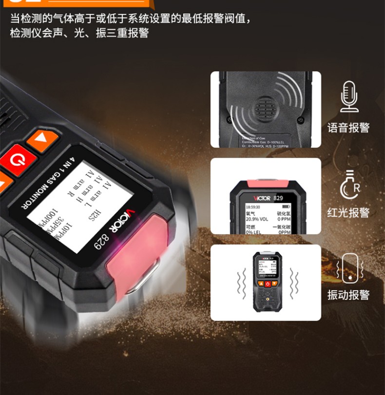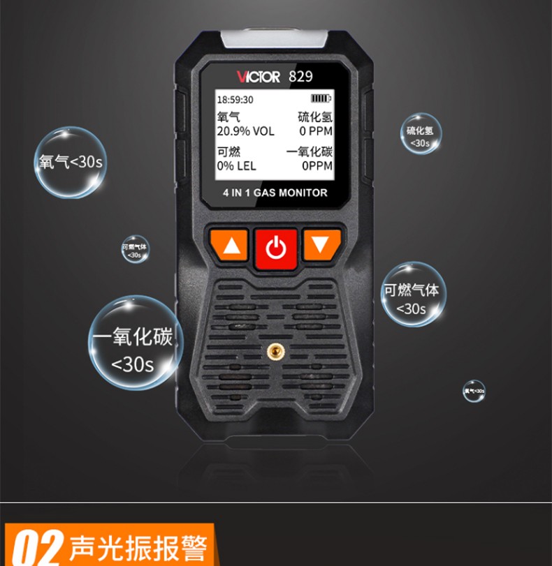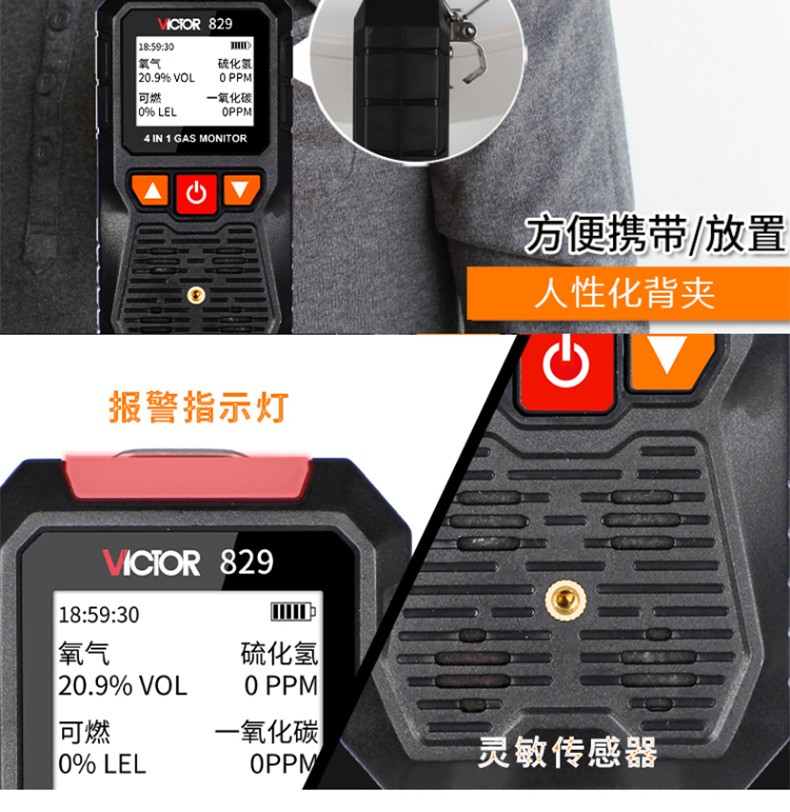 胜利仪器(VICTOR) VC829 四合一气体检测仪 硫化氢 可燃氧气 一氧化碳 VC829