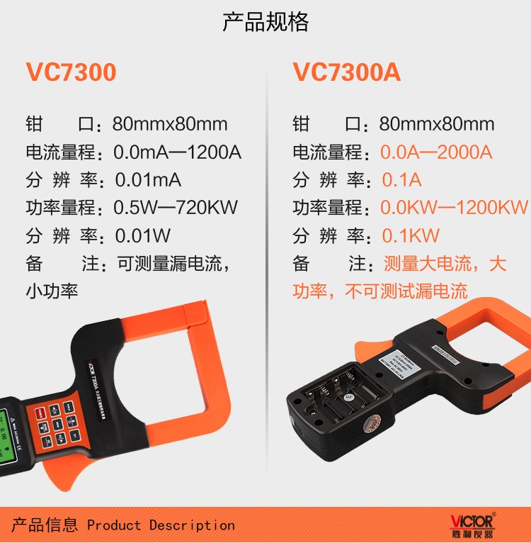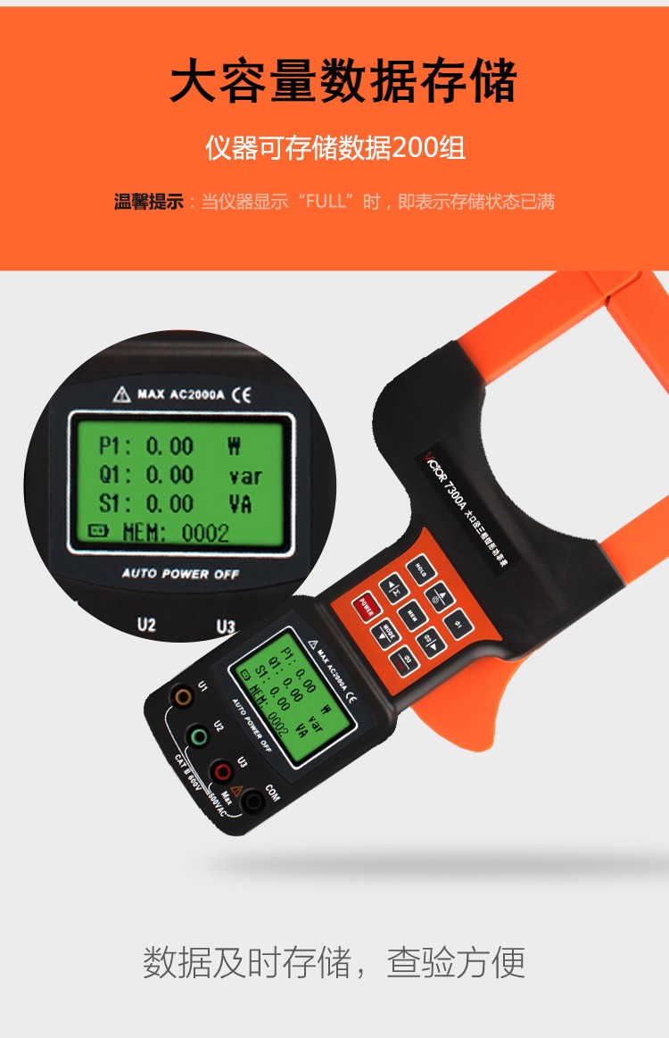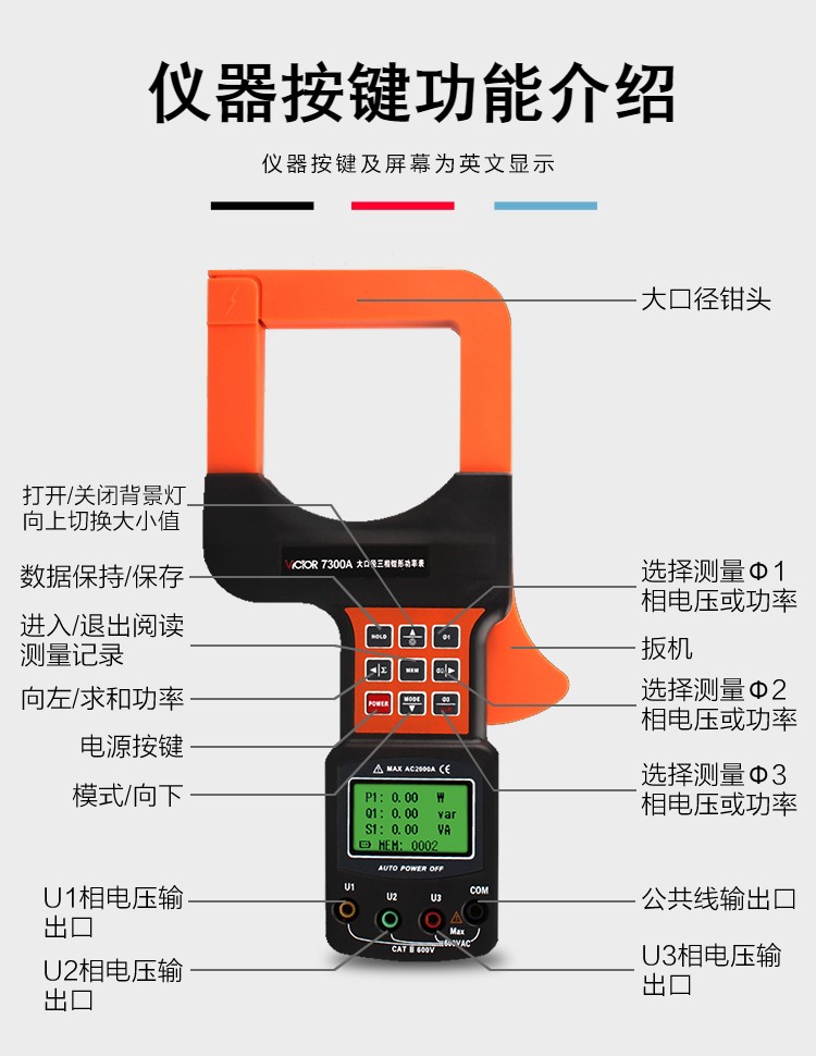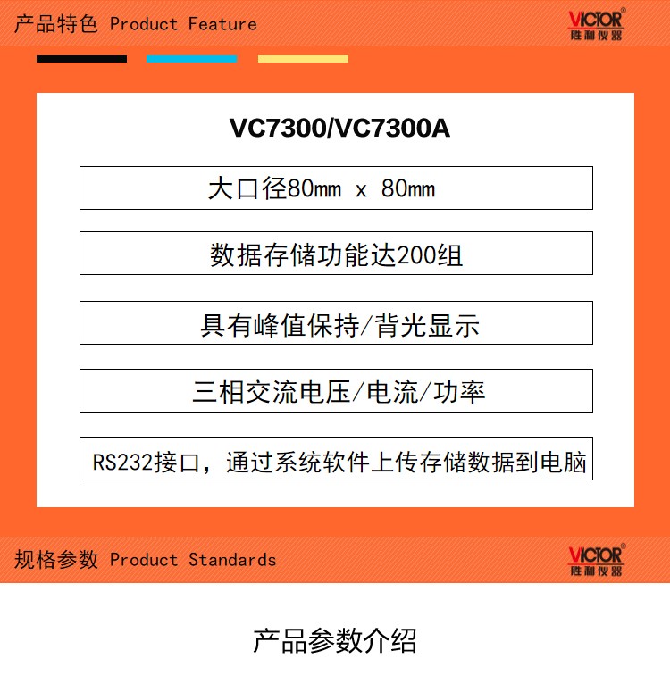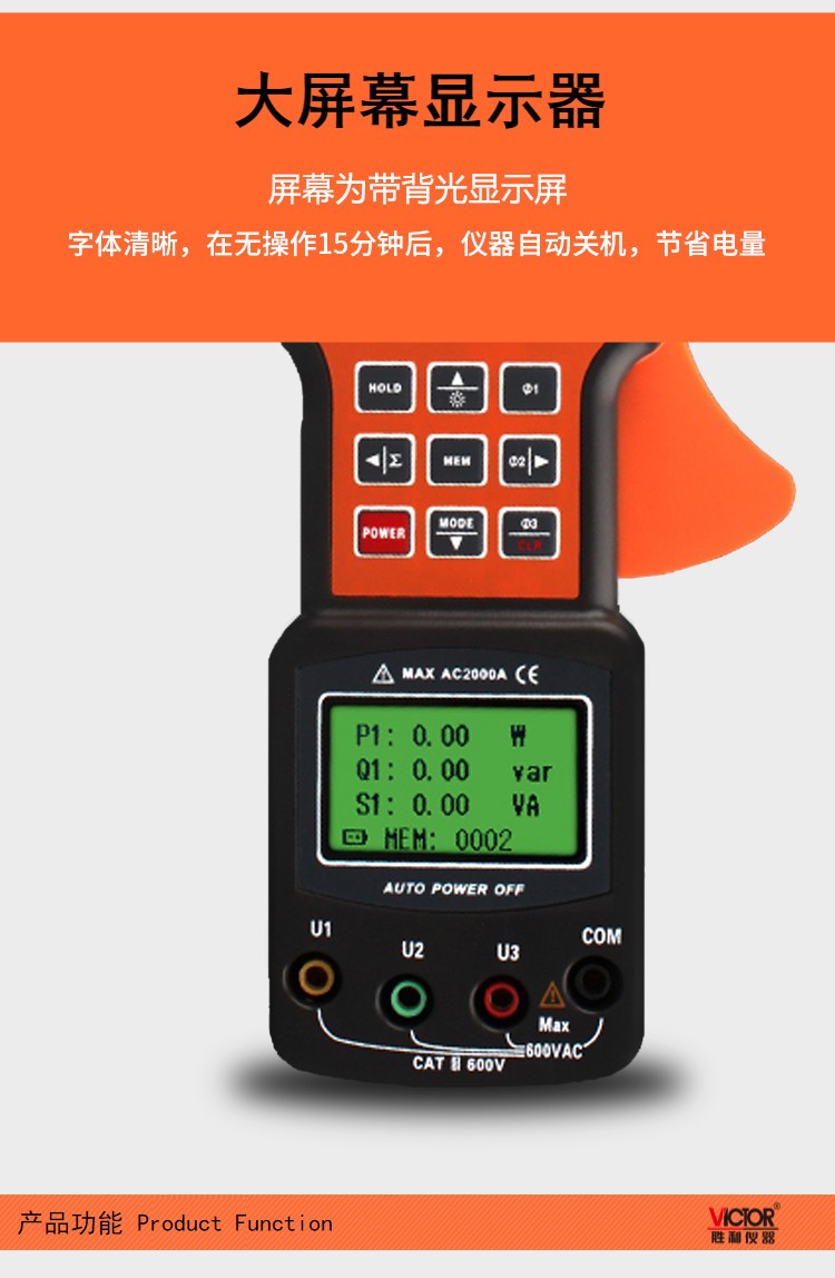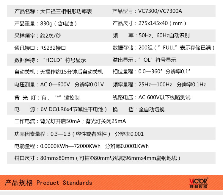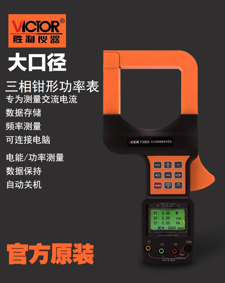 胜利仪器(VICTOR) VC7300A 三相数字钳形功率表带电脑接口 大口径三相钳形功率计 出厂标配